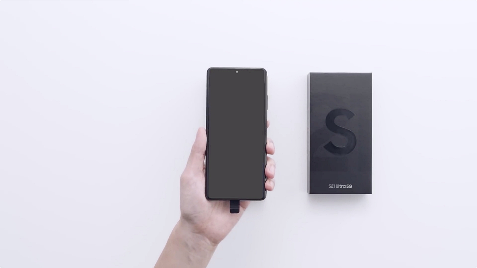 박스를 오픈하면 만날 수 있는 갤럭시S21 울트라 본체 입니다. 전면의 디자인적인 변화는 없어 보입니다.