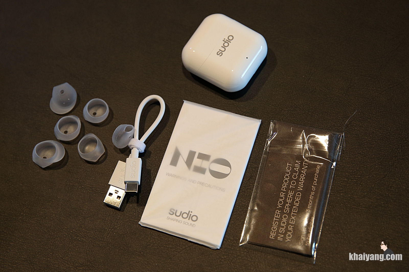 수디오 니오 본체와 함께 들어 있는 구성품 입니다. 다양한 사이즈의 이어팁과 USB-C 케이블, 설명서, 보증서가 들어 있습니다.