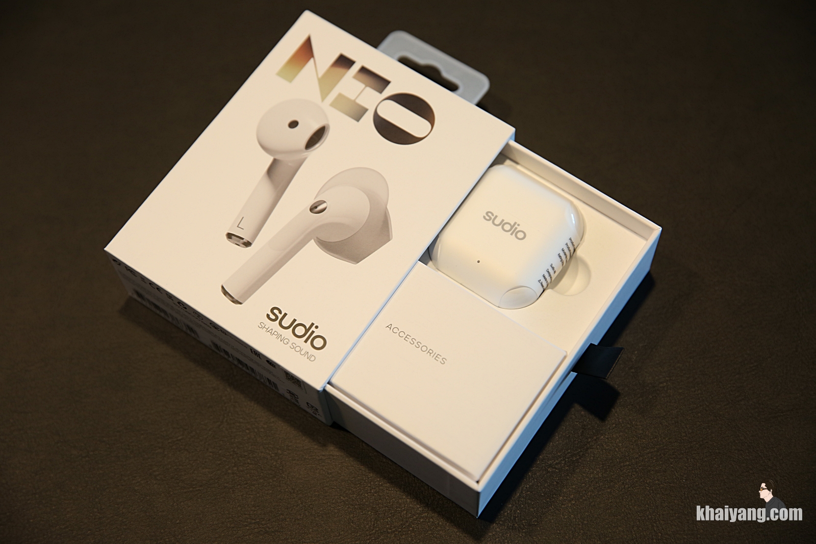 크래들 전면에 SUDIO 로고가 있고 니오 본체 입니다. 에어팟과 상당히 유사한 모습을 하고 있는 것을 확인 할 수 있습니다.