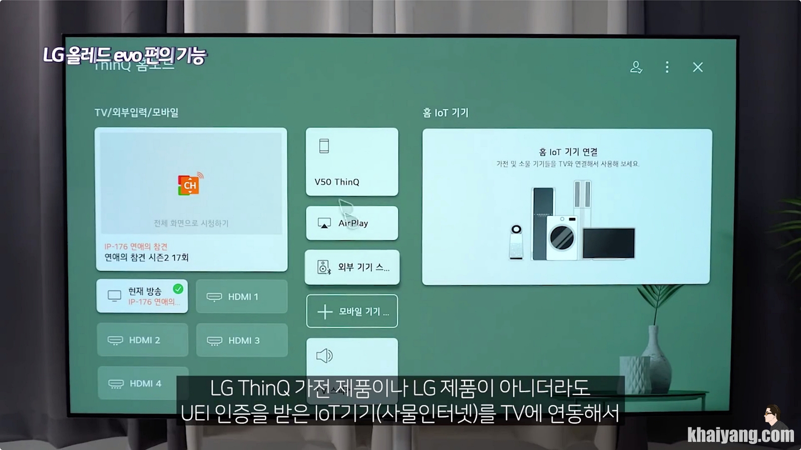 한눈에 보는 씽큐 홈보드 기능으로 LG ThinQ 가전 뿐만 아니라 UEI 인증 받은 IoT 기기들도 TV에 연동해서 기기의 상태를 확인하고 제어할 수 있습니다.