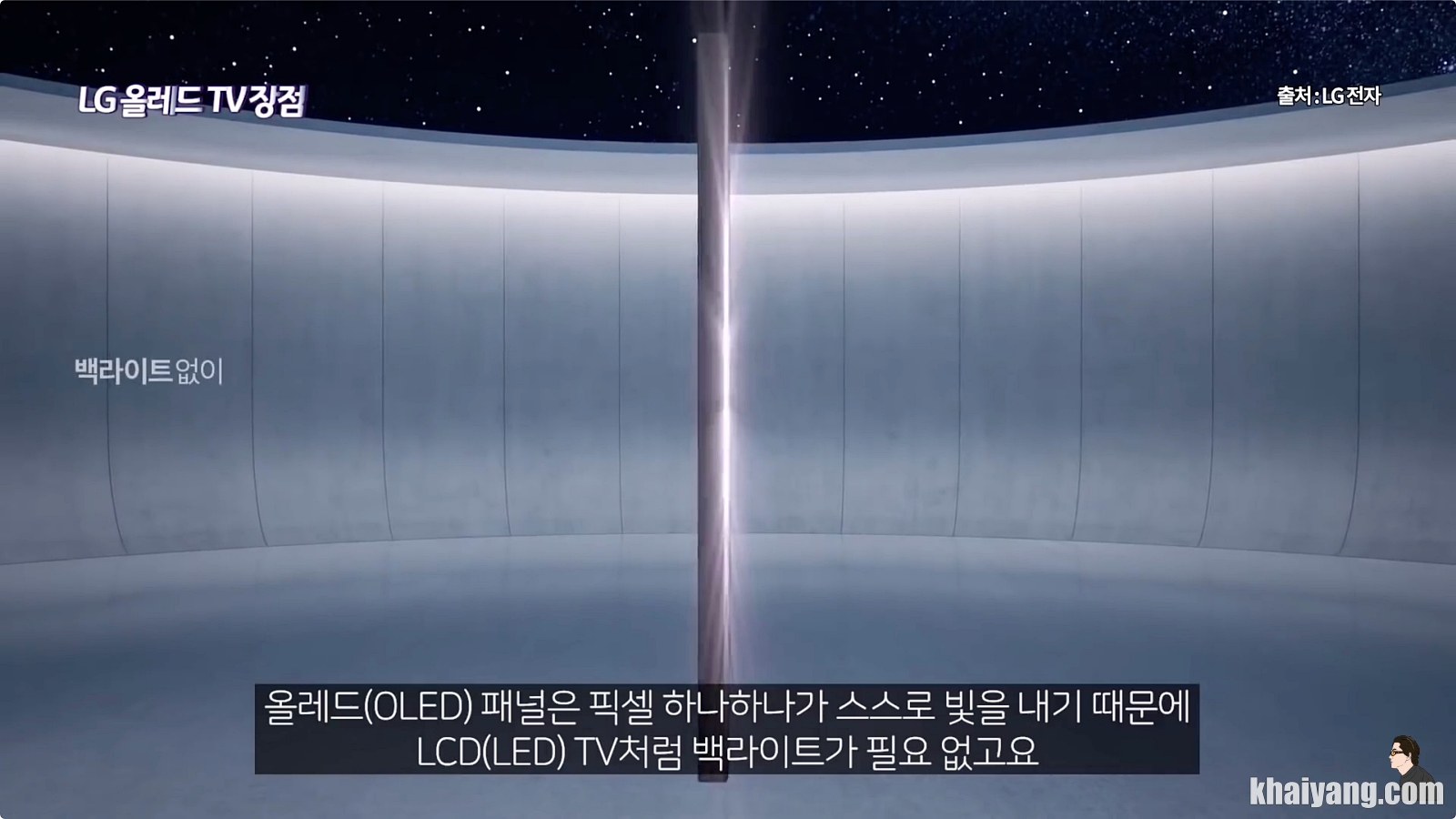 올레드TV의 장점은 올레드 패널 소자 하나 하나가 빛을 내기 때문에 검은색을 표현하는 부분의 소자는 빛을 끄는 방식으로 정확한 블랙 표련이 가능합니다.