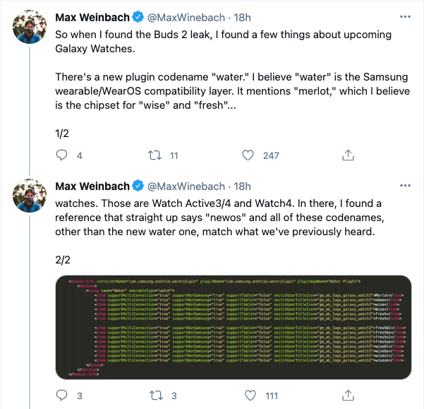 맥스 웨인바흐는 트위터에 “갤럭시 웨어러블 앱 소스에서 '워터'(water)라는 새로운 코드명의 플러그인을 발견했고 이 플러그인은 구글 웨어 OS 호환 레이어”라고 주장 했습니다.