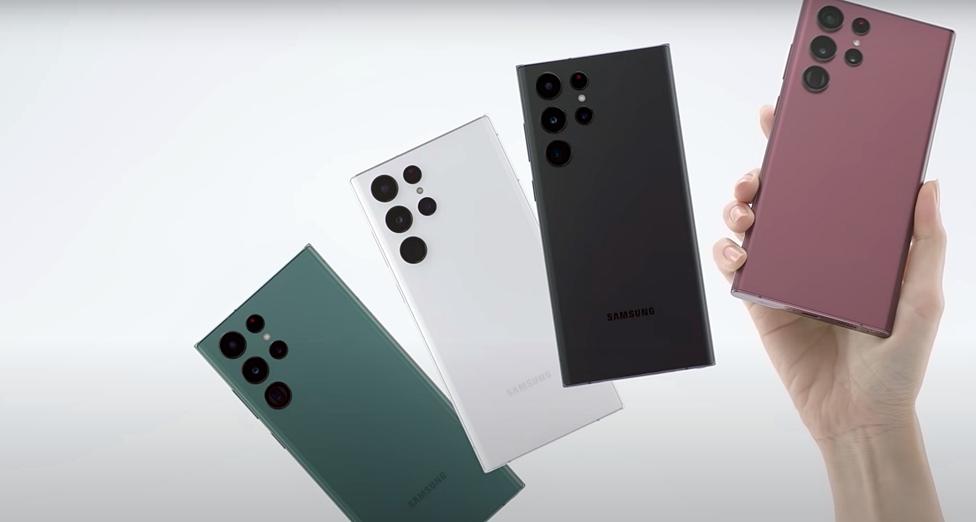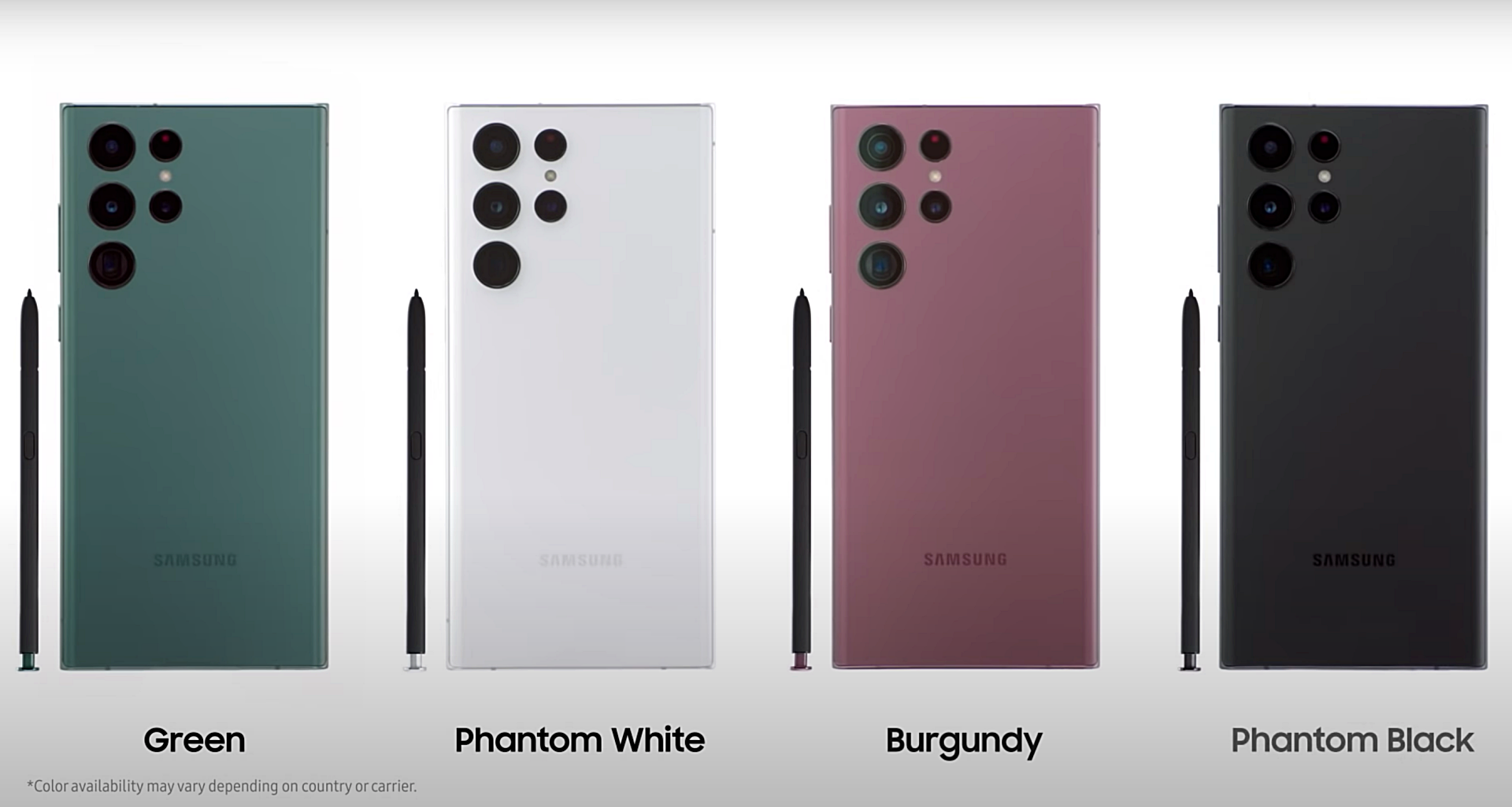 가운데 보이는 핑크색 갤럭시S22 울트라가 이번에 공개된 갤럭시S22 플래그십 모델입니다. 딱 봐도 생각나는 것이 갤럭시노트20 울트라에 카메라 디자인만 살짝 바꿨다는 느낌이 듭니다. 그리고 옆에 S펜도 같이 있습니다.