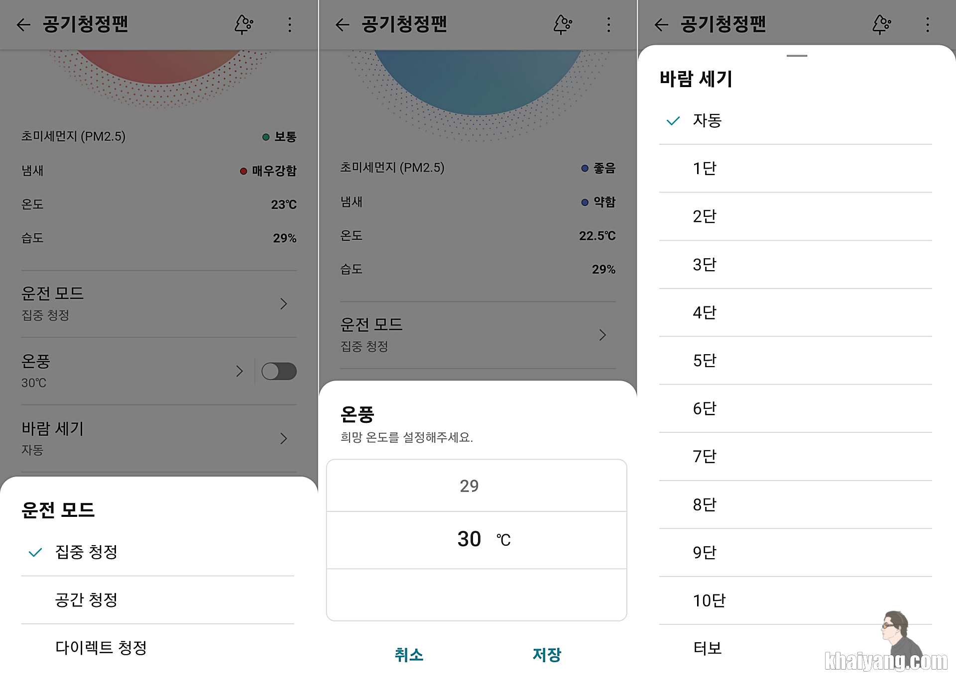 운전모드, 온풍, 바람 세기, 화면 밝기, 회전모드, 예약 설정 등 디테일한 설정이 모두 가능합니다.