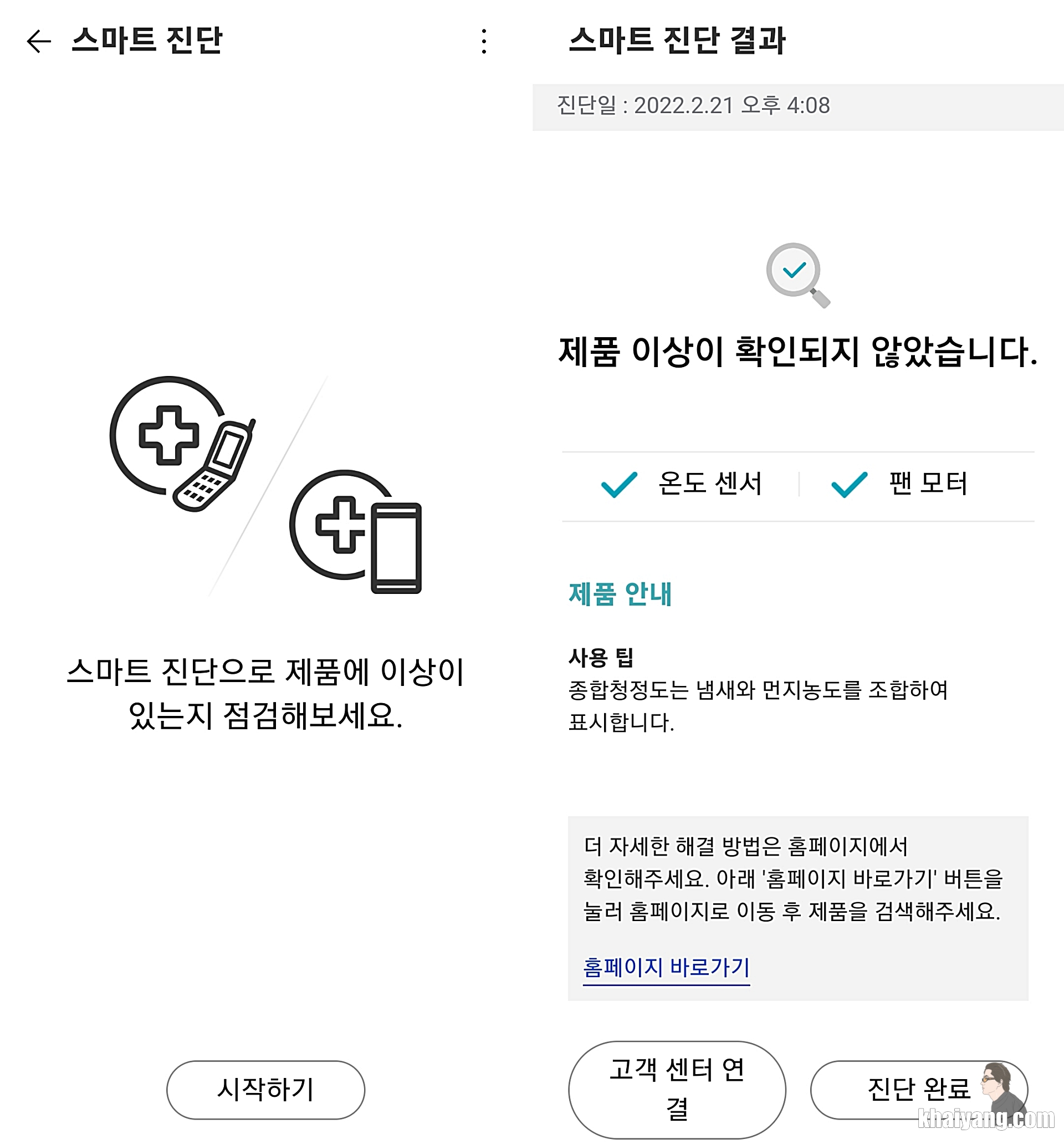 제품에 이상이 있는지 확인할 수 있는 스마트 진단도 손 쉽게 할 수 있습니다. 스마트 진단 메뉴에 가서 시작하기 버튼 누르면 제품 진단이 진행되고 이상이 있으면 바로 알려 줍니다.