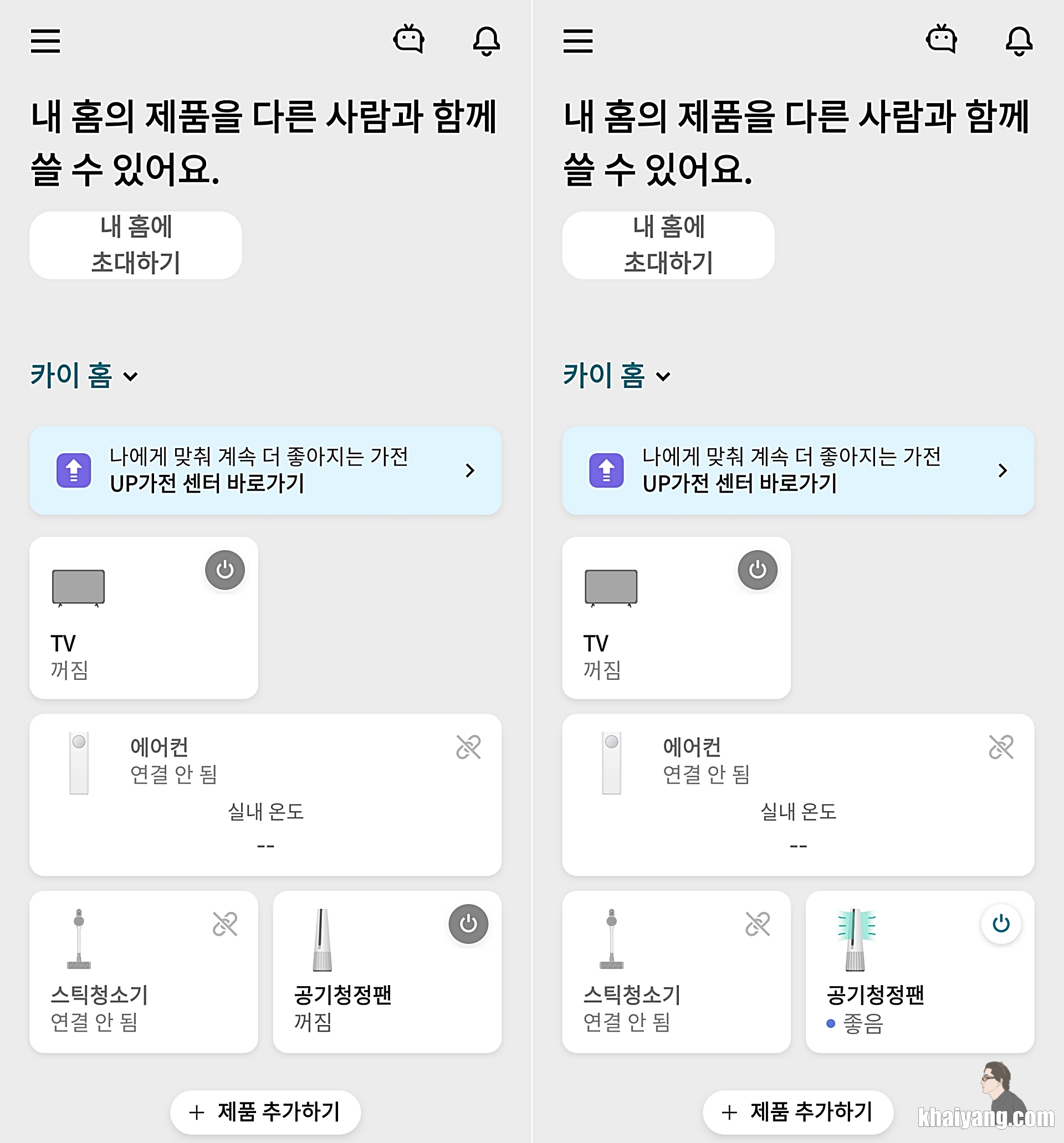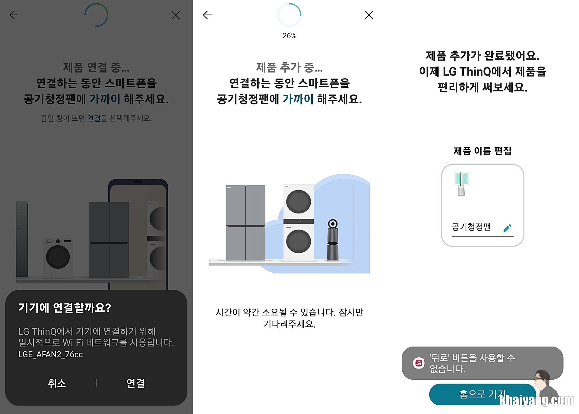 공기청정팬을 선택 하면 제품 추가중 화면이 나오고 조금 기다리시면 제품 추가 완료 되었다는 화면을 만날 수 있습니다. 이름은 본인이 원하는대로 바꿀 수 있습니다.