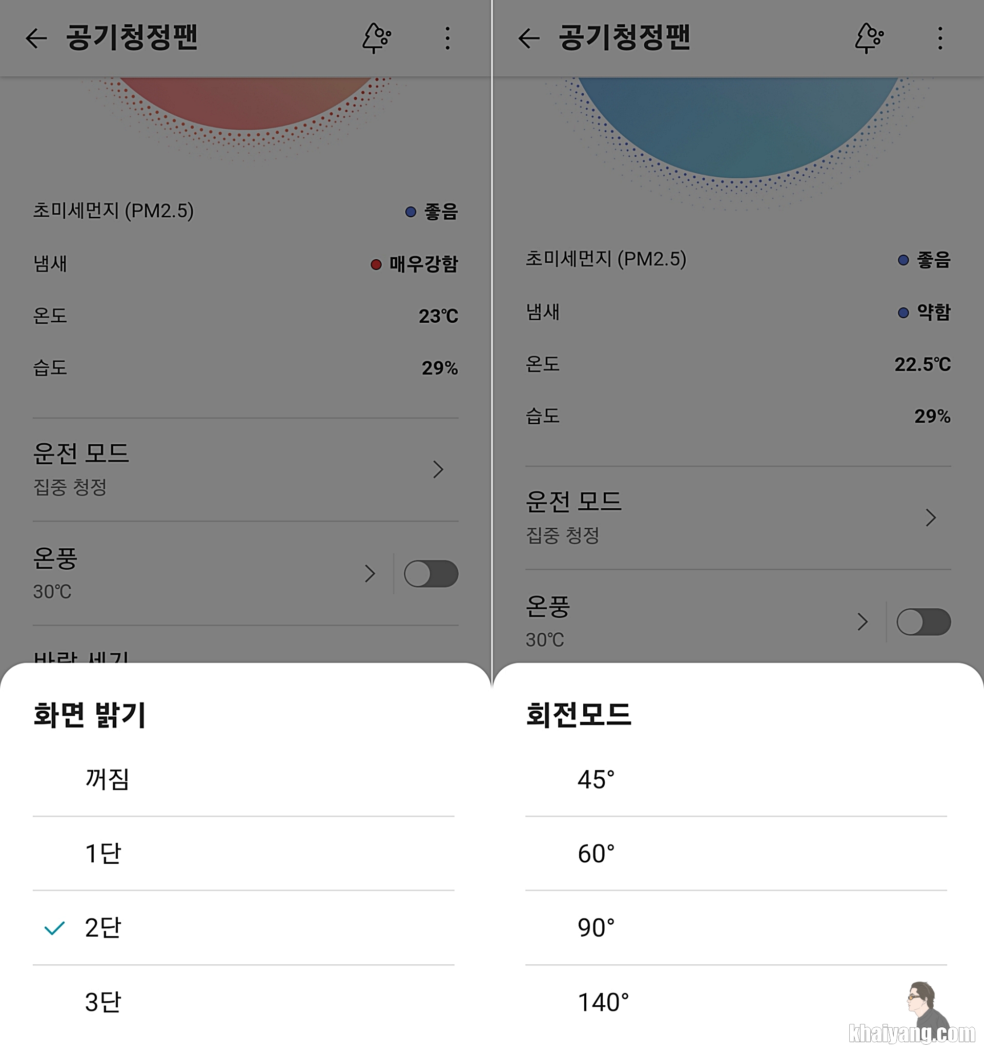 운전모드, 온풍, 바람 세기, 화면 밝기, 회전모드, 예약 설정 등 디테일한 설정이 모두 가능합니다.