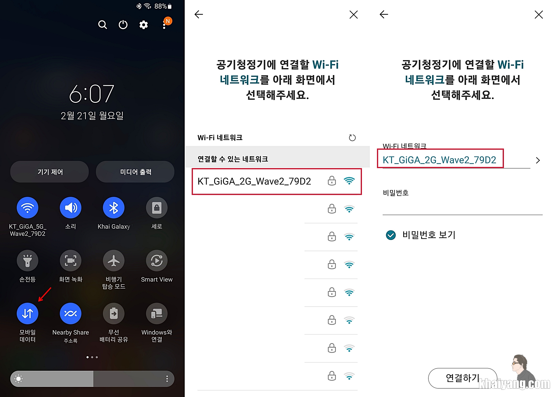 스마트폰에서 설정에 들어 가거나 상단 메뉴를 열어서 모바일 데이터를 꺼주세요. 그리고 나서 와이파이 연결에 들어가셔서 연결 네트워크를 검색 합니다.