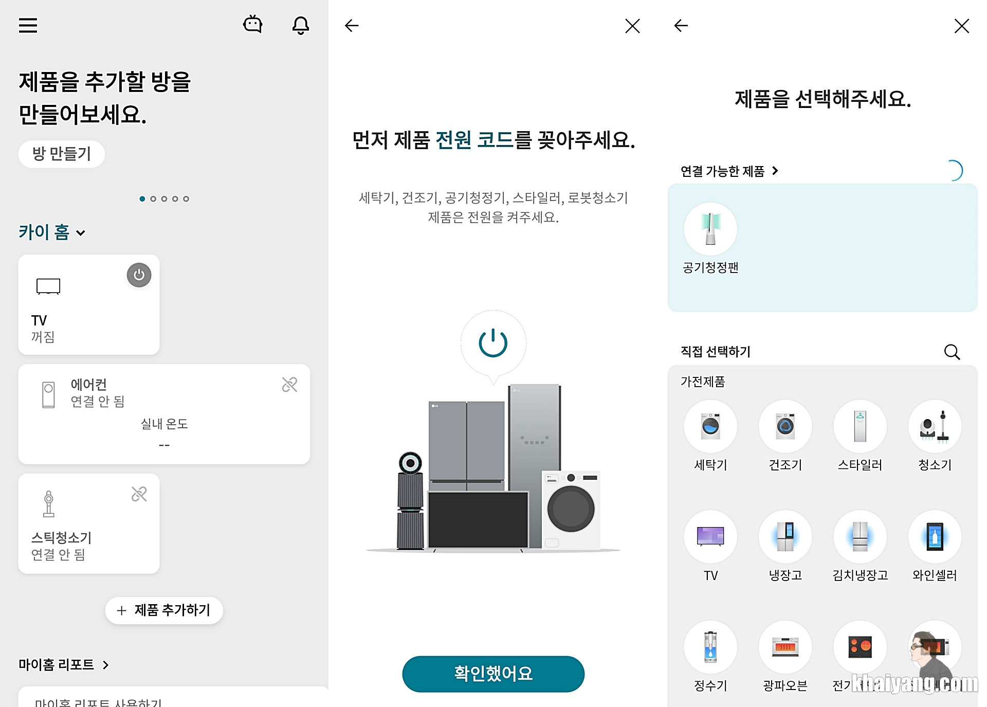 LG씽큐앱 들어가서 제품 추가하기 버튼 누르고 나서 화면에서 설명하는데로 따라가면 문제 없이 설정할 수 있습니다. 공유기 네트워크 선택할때는 2G로 하시면 됩니다.