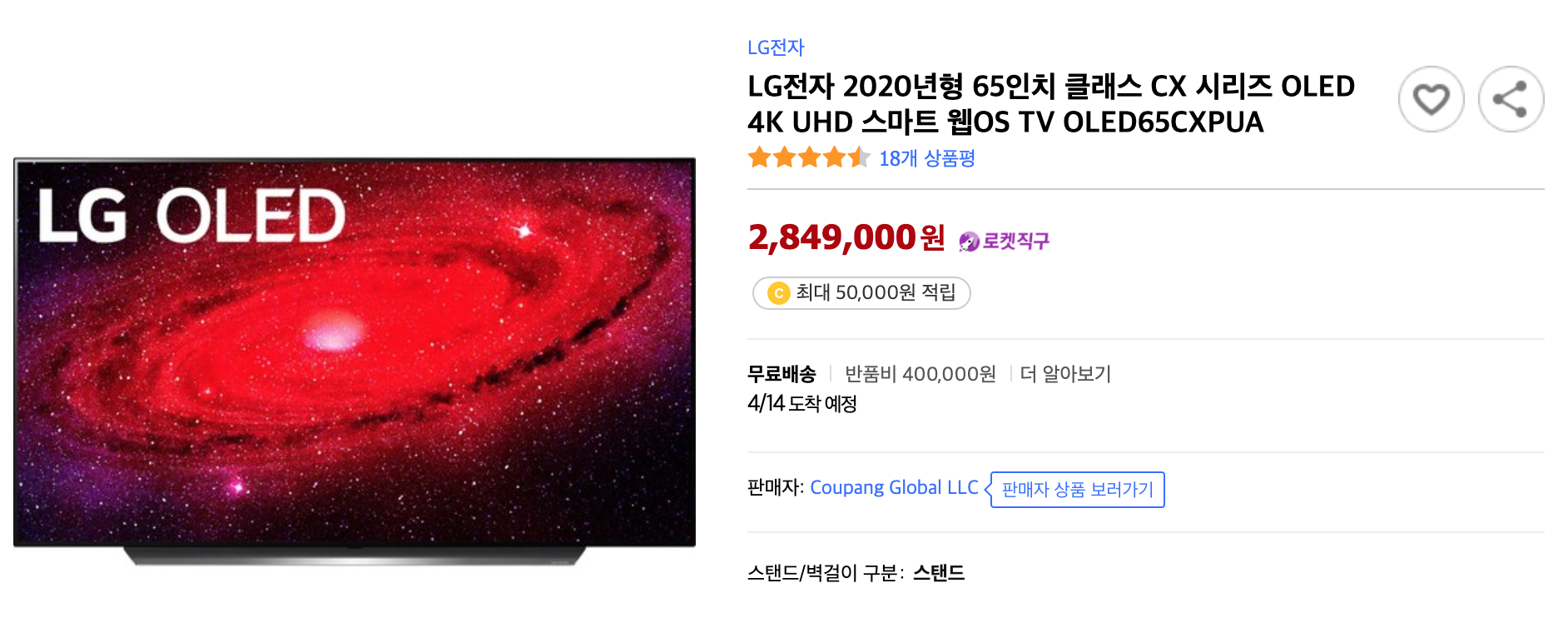 특히 LG OLED65CXPUA는 올해 최고 TV 가운데서도 가장 높은 성능평가를 받았습니다. 네이버에 검색해보니 국내에서는 직구로만 구매를 할 수 있는 제품입니다.