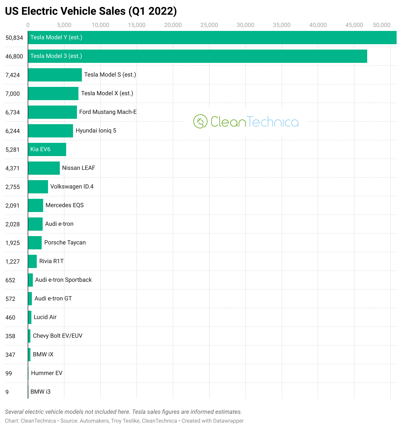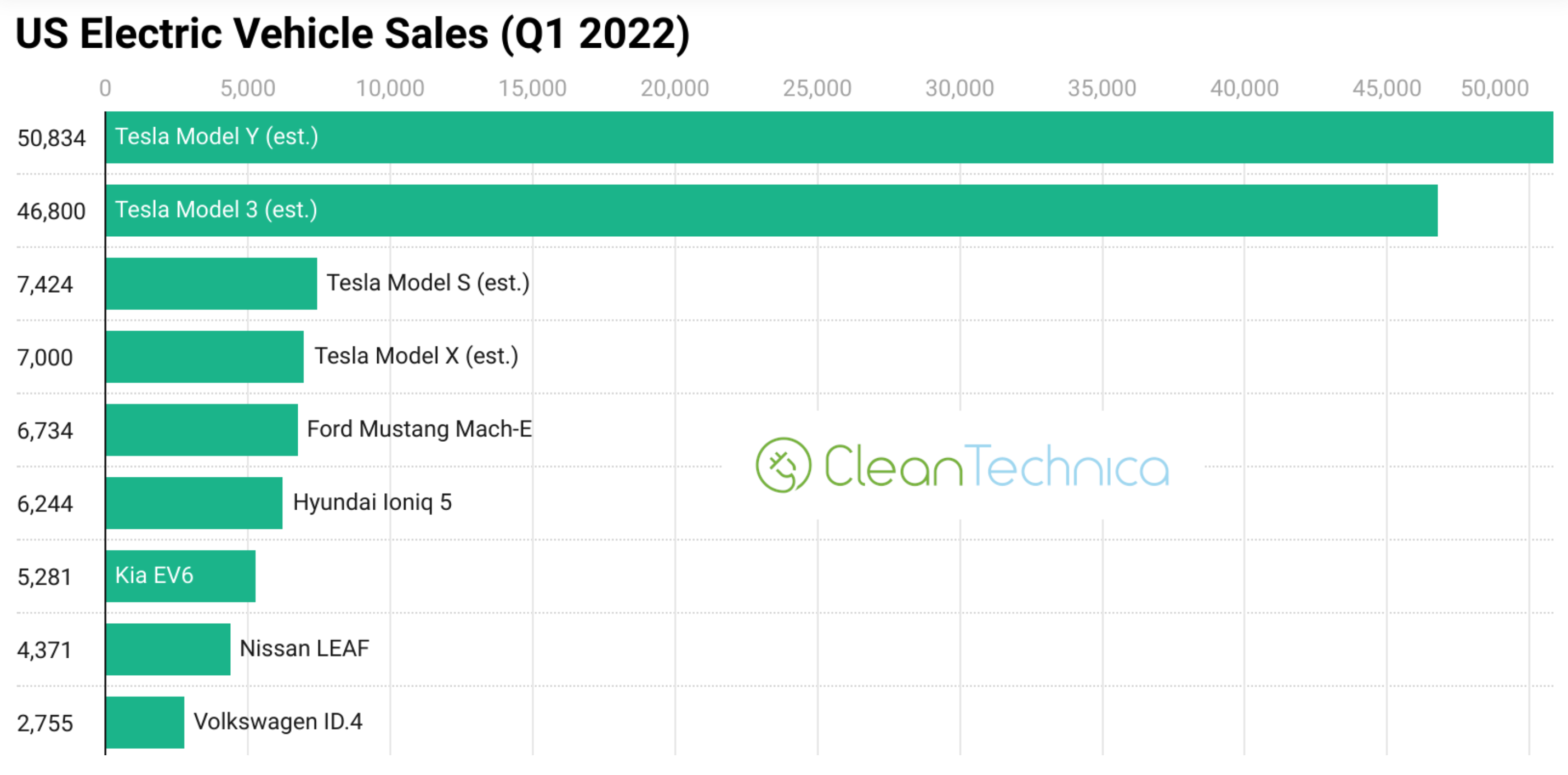 2022년 1쿼터 미국 전기차 판매량을 찾아 보니 중저가형 모델인 모델Y, 모델3가 압도적인 판매량을 보여주고 있습니다.