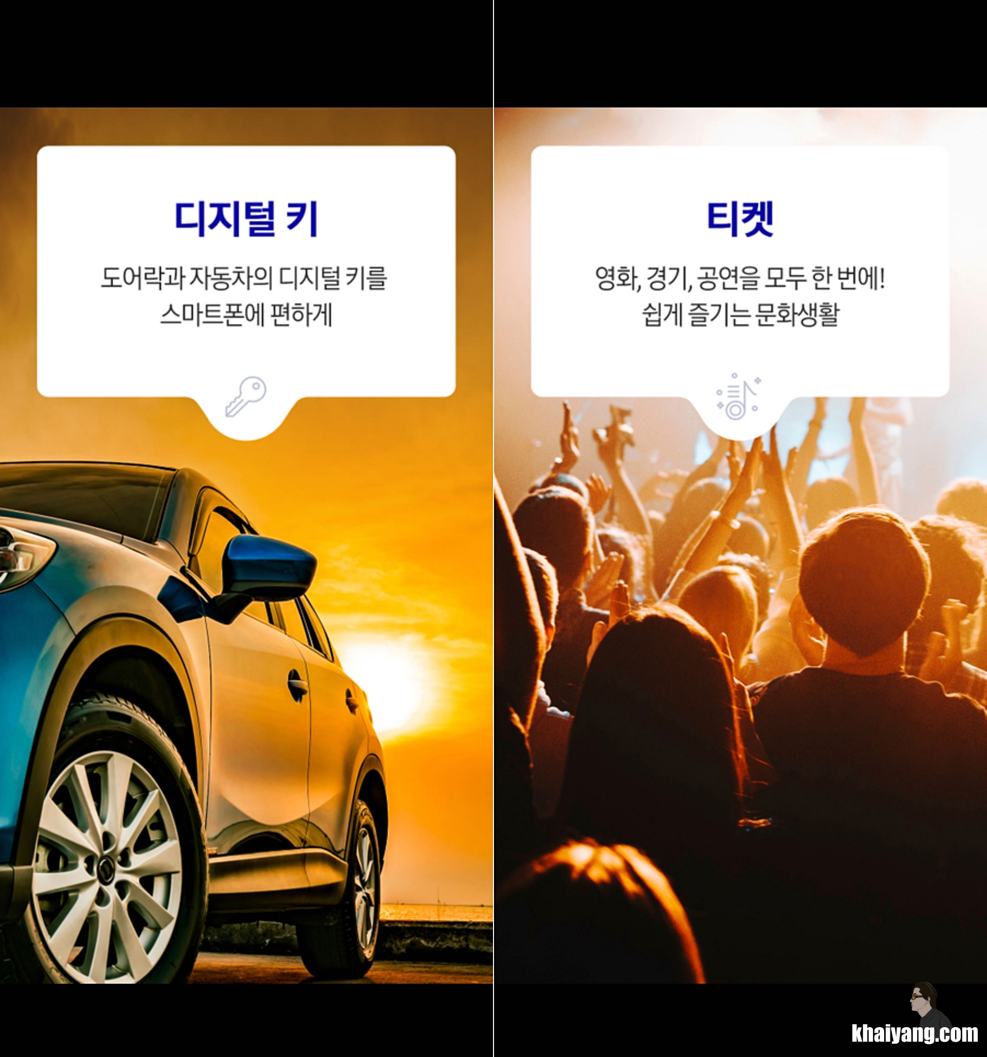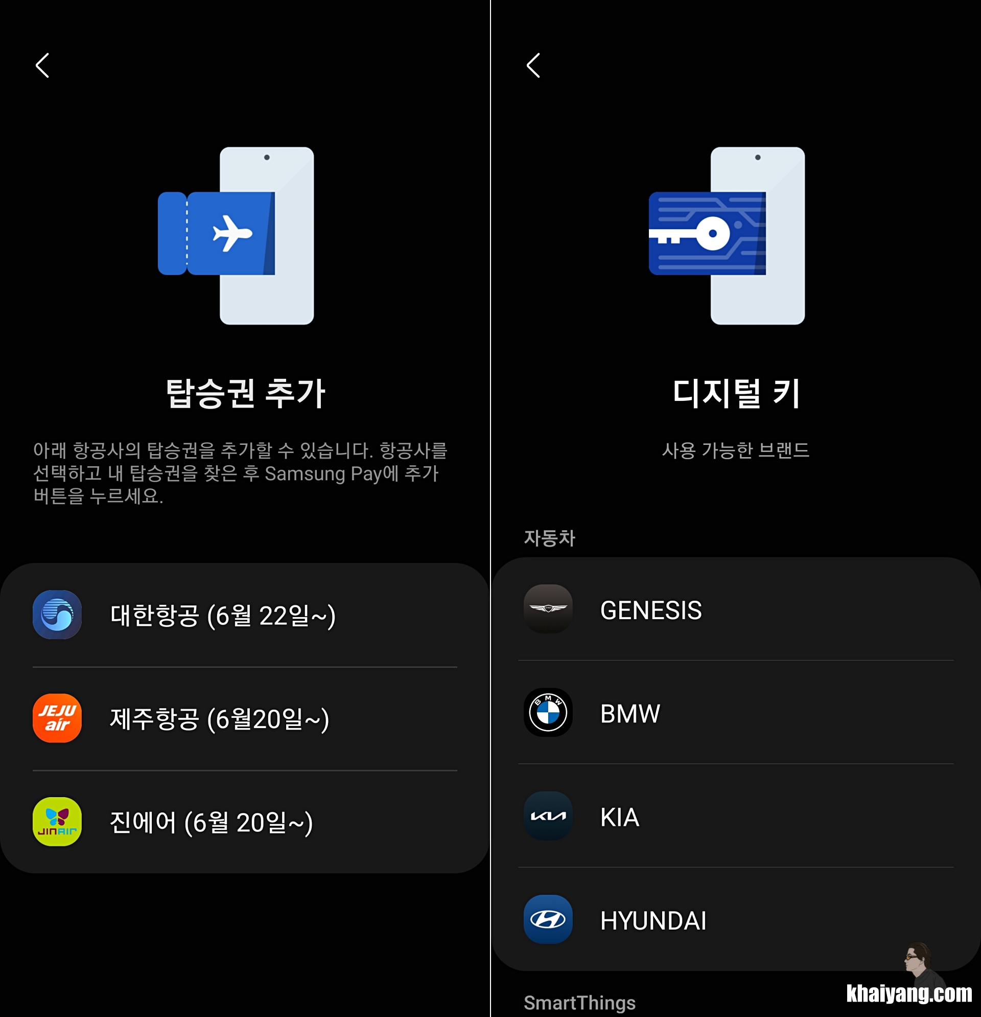탑승권은 대한항공, 제주항공, 진에어를 추가할 수 있고 디지털 키는 제네시스, BMW, 현대, 기아를 지원하고 있고 스마트씽스를 통해 도어락도 연결할 수 있습니다.