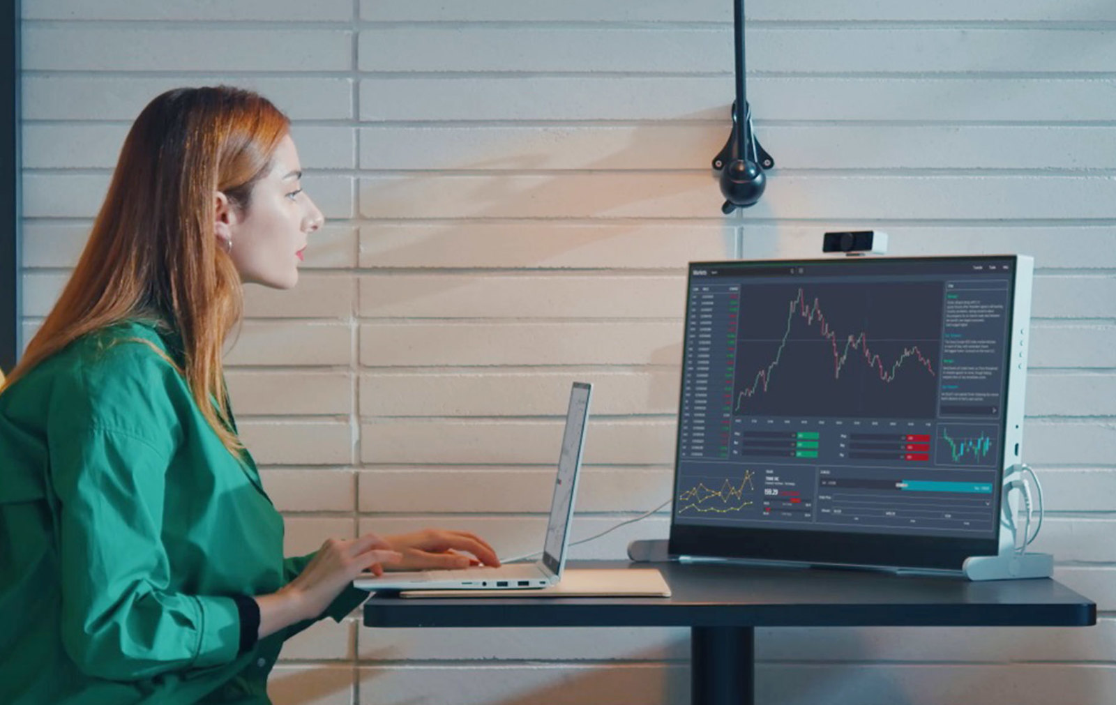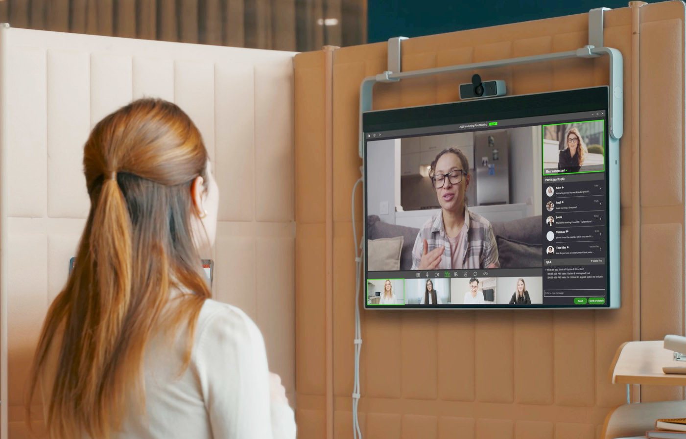 사진에서 보시면 화상회의를 하는 모습이 보이는데 탈부착이 가능한 마이크가 내장된 전용 웹캠(Webcam)과 2채널 스테레오 스피커 등을 갖춰 화상회의나 온라인수업에 유용합니다.