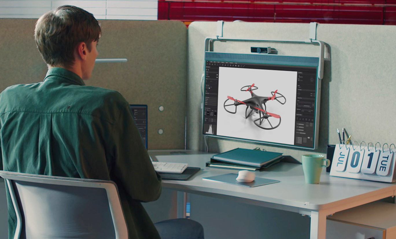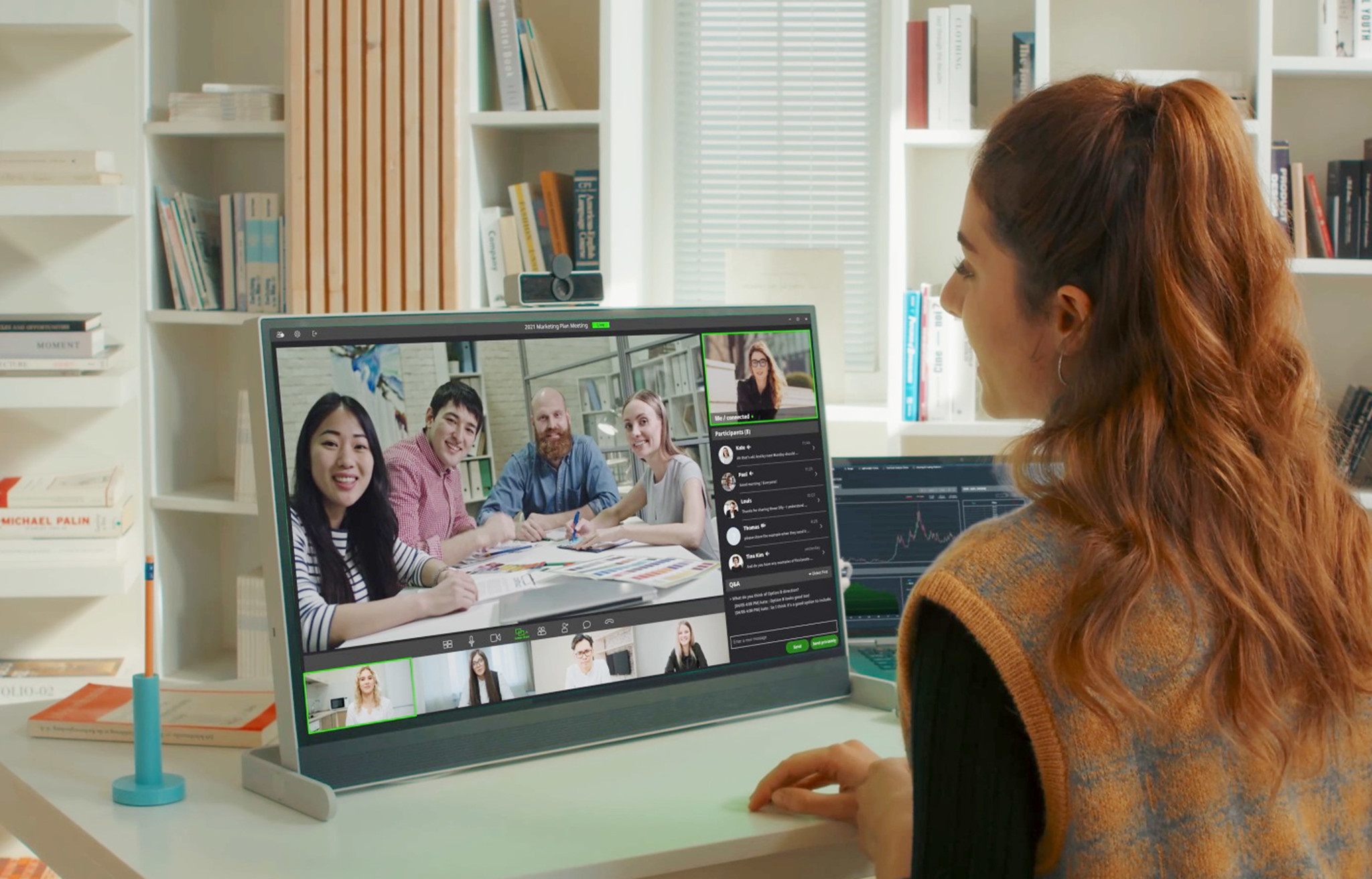 사진에서 보시면 화상회의를 하는 모습이 보이는데 탈부착이 가능한 마이크가 내장된 전용 웹캠(Webcam)과 2채널 스테레오 스피커 등을 갖춰 화상회의나 온라인수업에 유용합니다.