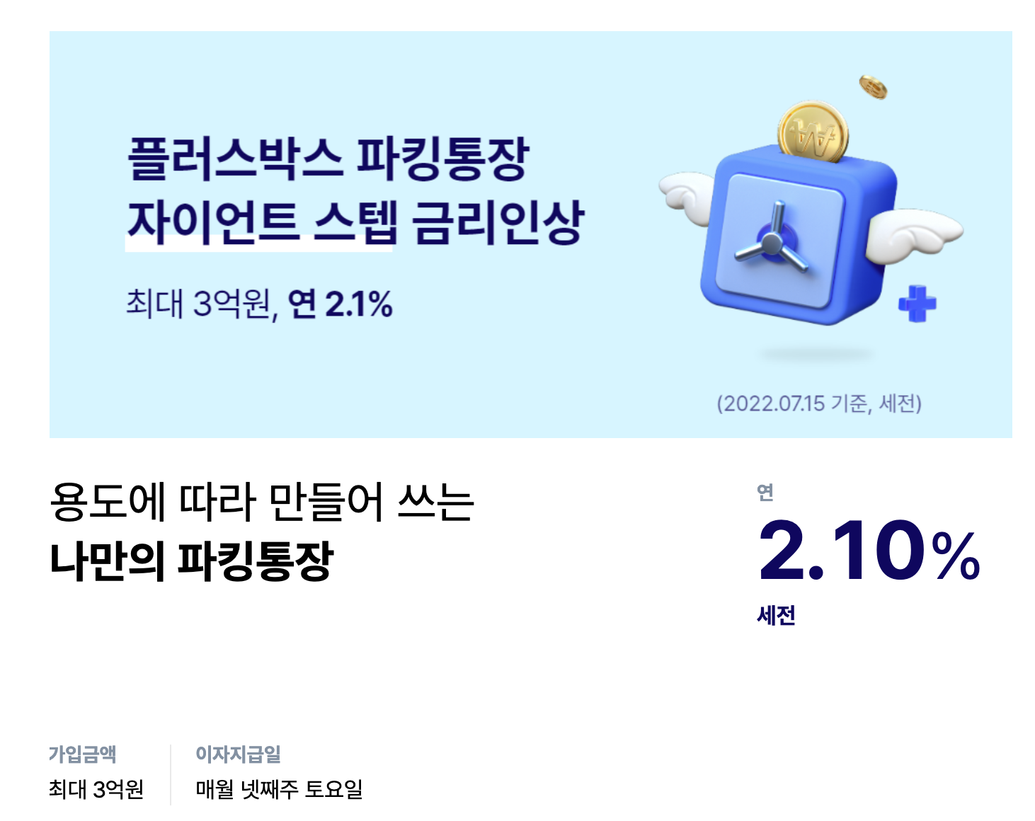 게다가 이 상품이 마음에 드는 것이 3억 까지 이 금리를 그대로 제공한다는 겁니다. 그동안 소규모 금액만 높은 금리를 제공했는데 3억까지 2.10%를 제공한다는 것은 상당한 메리트가 있습니다.