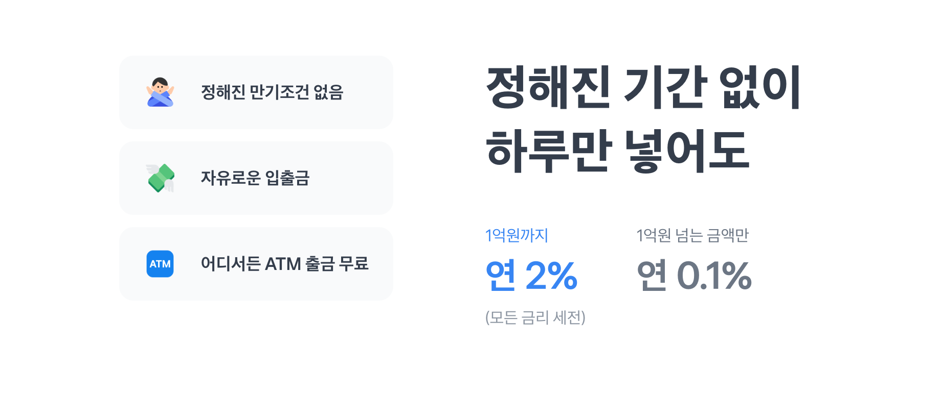 1억원까지 연 2%를 제공하는데 3억까지 2.1%를 제공하는 케이뱅크보다 낮기 때문에 굳이 이동할 필요성은 없었습니다. 게다가 1억원이 넘는 금액은 연 0.1%만 제공하고 있습니다.