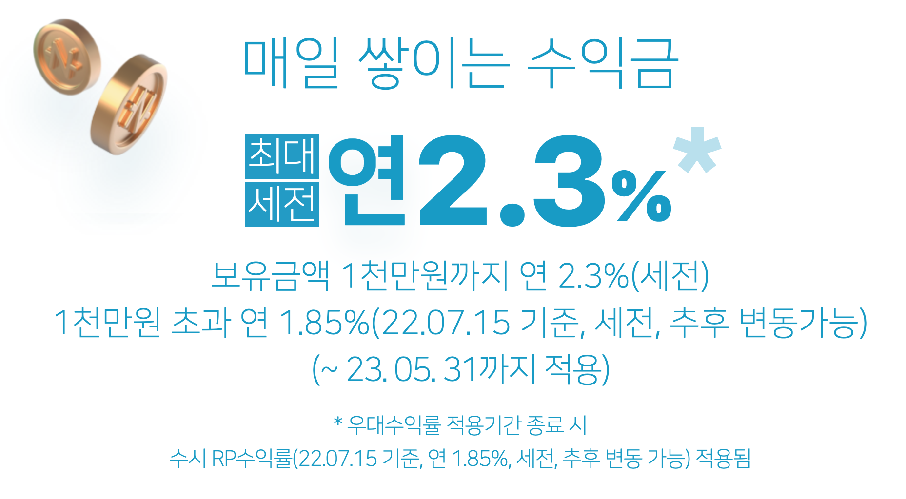 빠르게 살펴보니 연 2.3%(세전) 수익률을 제공한다고 하더군요. 자세히 보니 케이뱅크처럼 3억원까지는 아니고 천만원까지만 이 금리를 적용하고 1천만원 초과시에는 연 1.85%만 제공을 한다고 합니다.