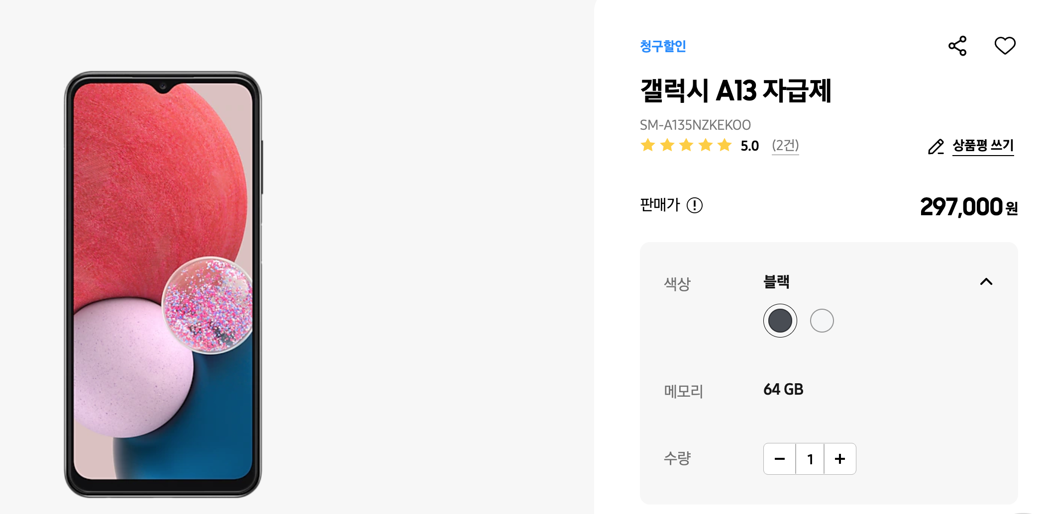 갤럭시 A13은 자급제와 이동통신 3사 모델로 출시되며, 가격은 29만 7천원입니다. 색상은 블랙, 화이트 2가지로 나옵니다. 삼성닷컴이나 오픈마켓에서 자급제폰으로 구매를 한 다음에 알뜰폰에서 저렴한 요금제를 이용하신다면 부담되지 않은 가격으로 사용할 수 있습니다.
