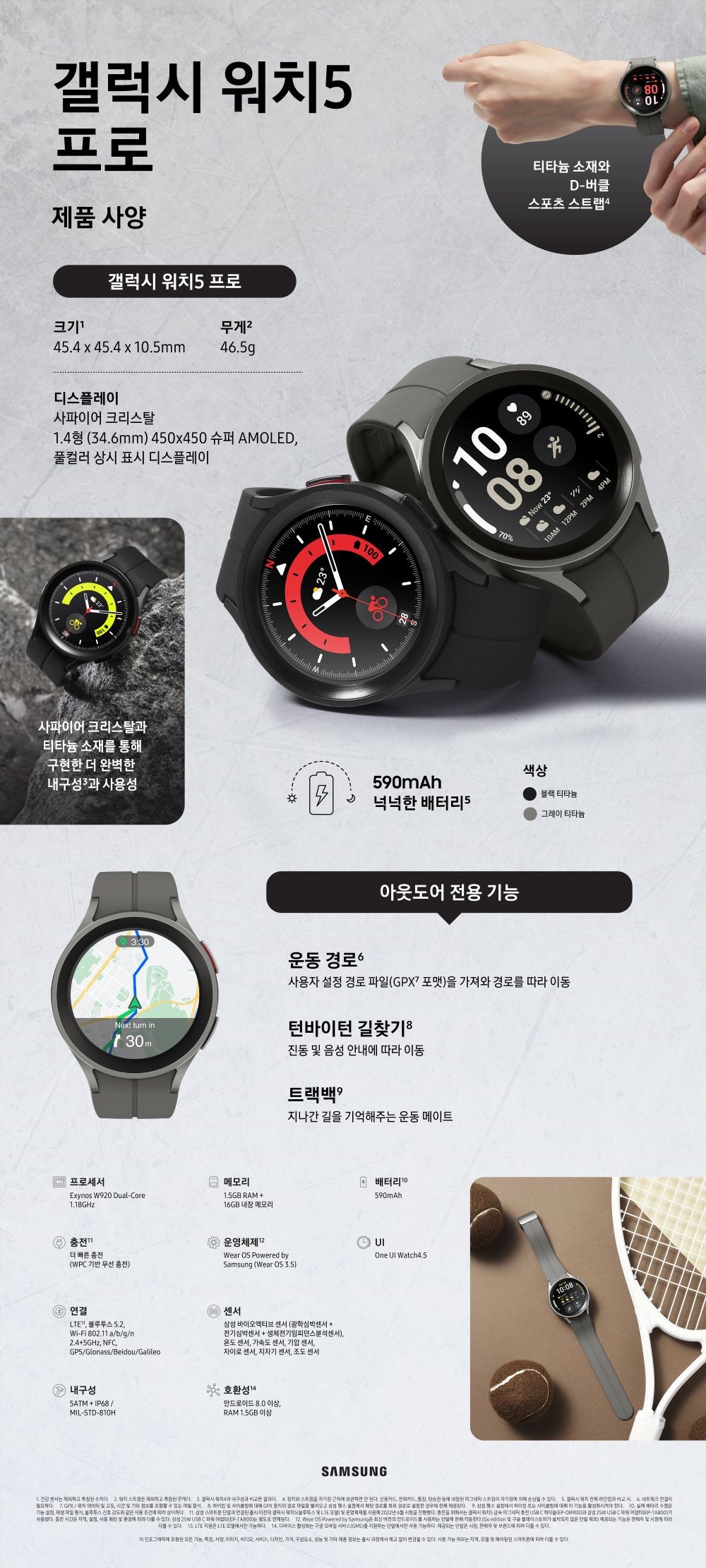 여러가지 부분이 개선되었는데 가장 기대했던 하드웨어 성능이 이전 갤럭시워치4 대비 좋아진 부분이 없습니다. AP 는 엑시노스 W920 칩으로 동일하고 램은 1.5GB, 저장공간 16GB 로 역시 동일 합니다.