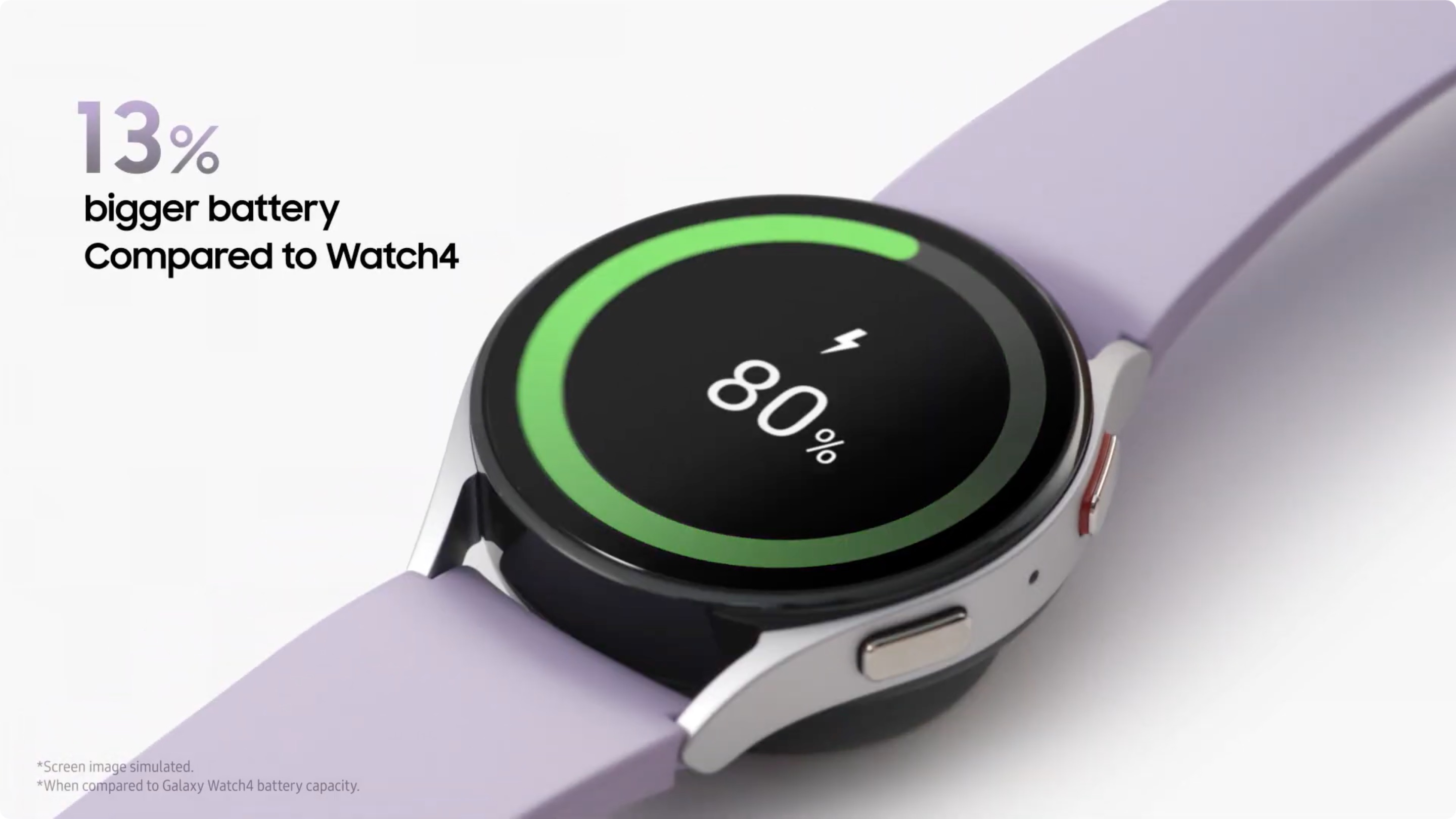 워치4 대비 배터리 용량이 13% 늘어나 워치 44mm 모델은 410mAh, 40㎜ 모델은 284mAh 입니다.