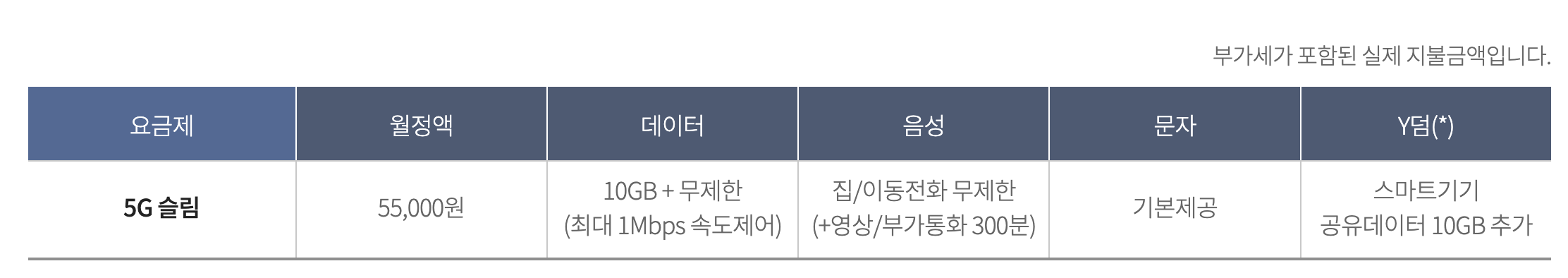 8천원을 더 내면 데이터는 80GB 용량을 더 쓸고 있고 무제한 5Mbps 까지 지원을 하기에 과연 매력적인 요금제인지 모르겠습니다. 슬림플러스는 6만원대라는 금액대도 높은 편인데 그래도 소비자에게 어필을 하려고 했다면 무제한 속도를 1Mbps가 아닌 3Mbps 까지는 지원을 해줬어야 했습니다.