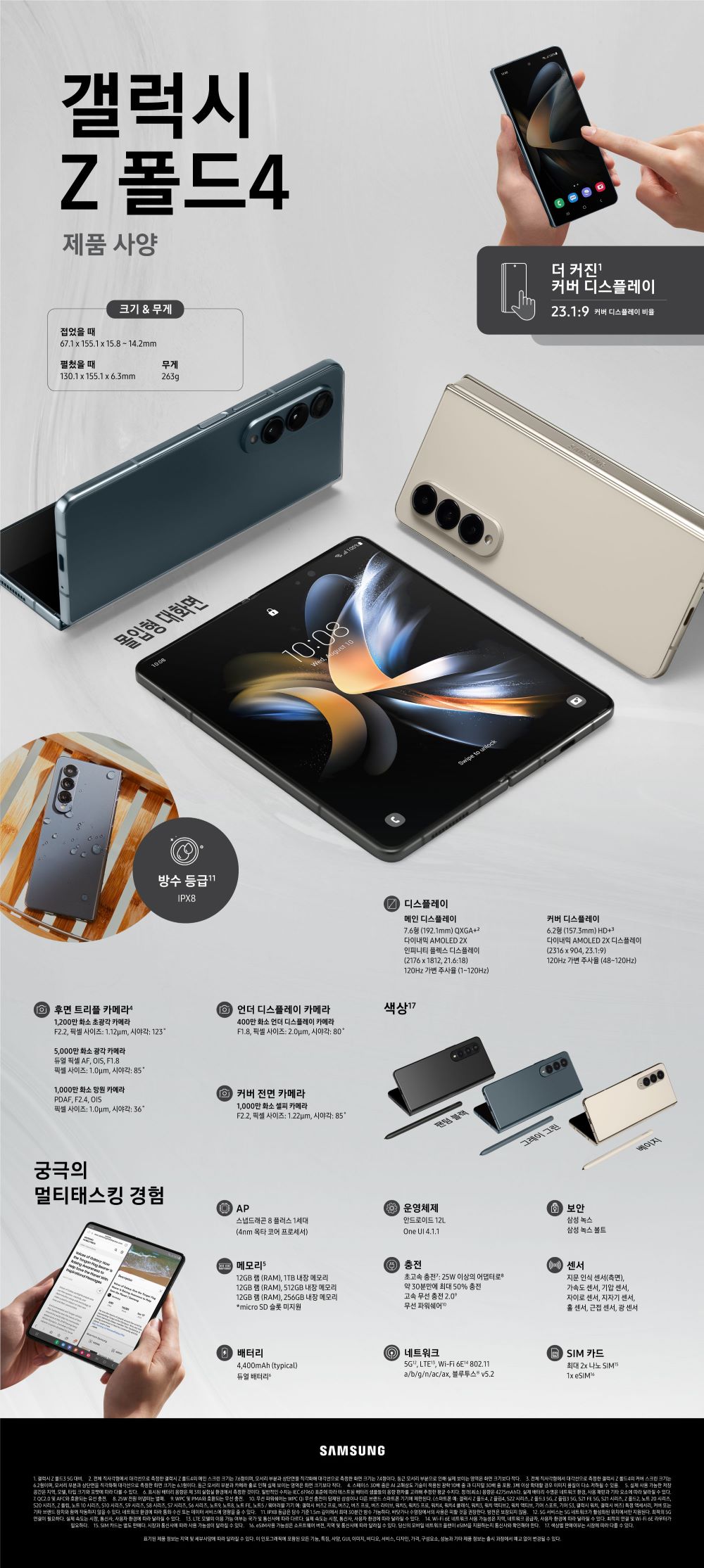 화면 크기는 폴드3 와 동일합니다. 메인 화면은 7.6인치, 커버 화면은 6.2인치 AMOLED 디스플레이를 그대로 적용했지만 화면 비율이 바뀌었습니다.