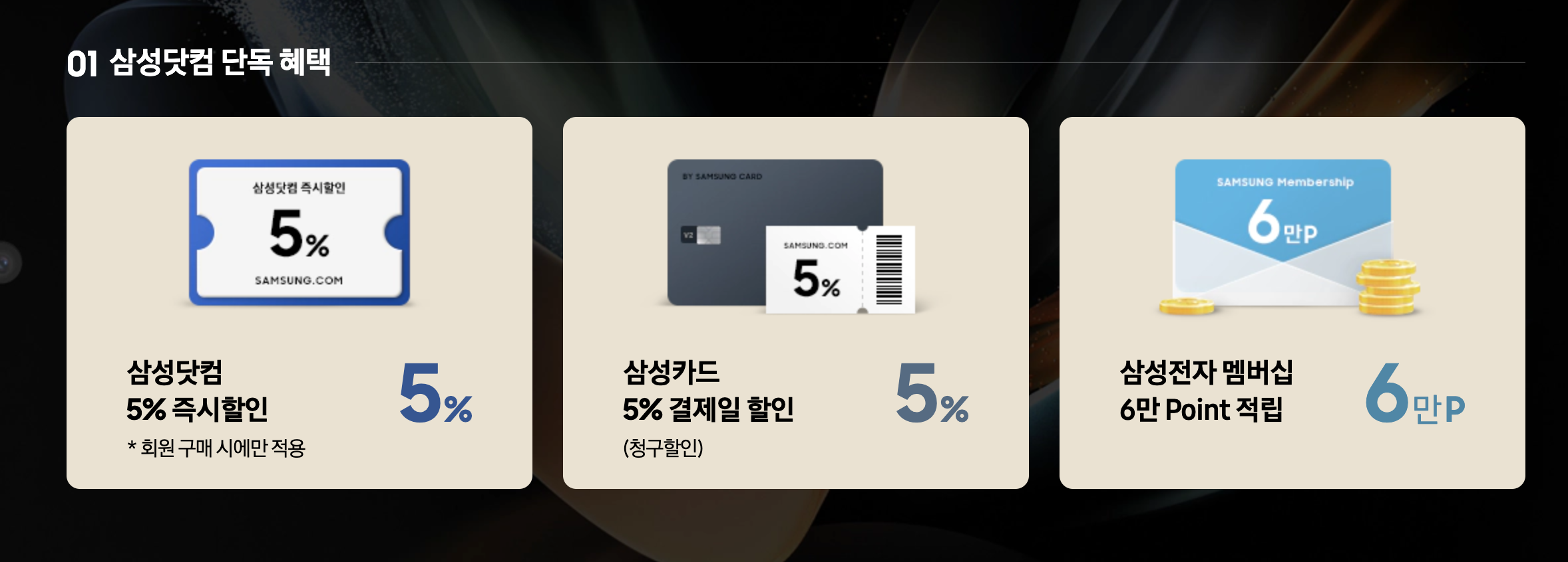 다른 오픈마켓과 달리 삼성닷컴에서는 삼성카드만 할인혜택을 받을 수 있습니다.