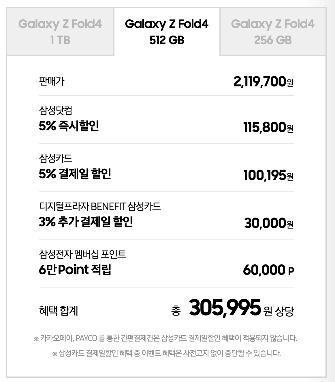 512GB 모델은 총 305,995원의 할인 혜택을 받을 수 있습니다.