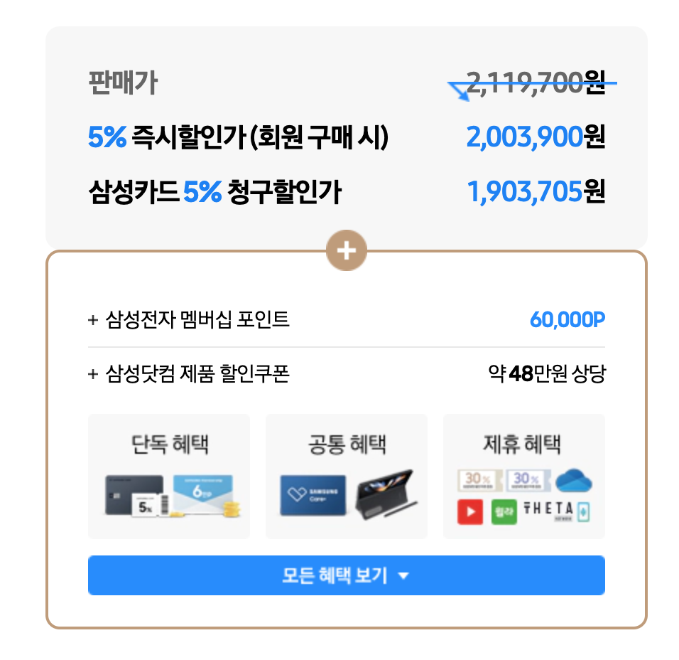 회원(5%) + 삼성카드(5%) + 4만 포인트(멤버십가입)는 기본적으로 받을 수 있지만 그 외 할인 혜택은 자세히 살펴 보시기 바랍니다. 그리고 삼성카드 같은 경우 24개월 무이자 할부도 가능 합니다.