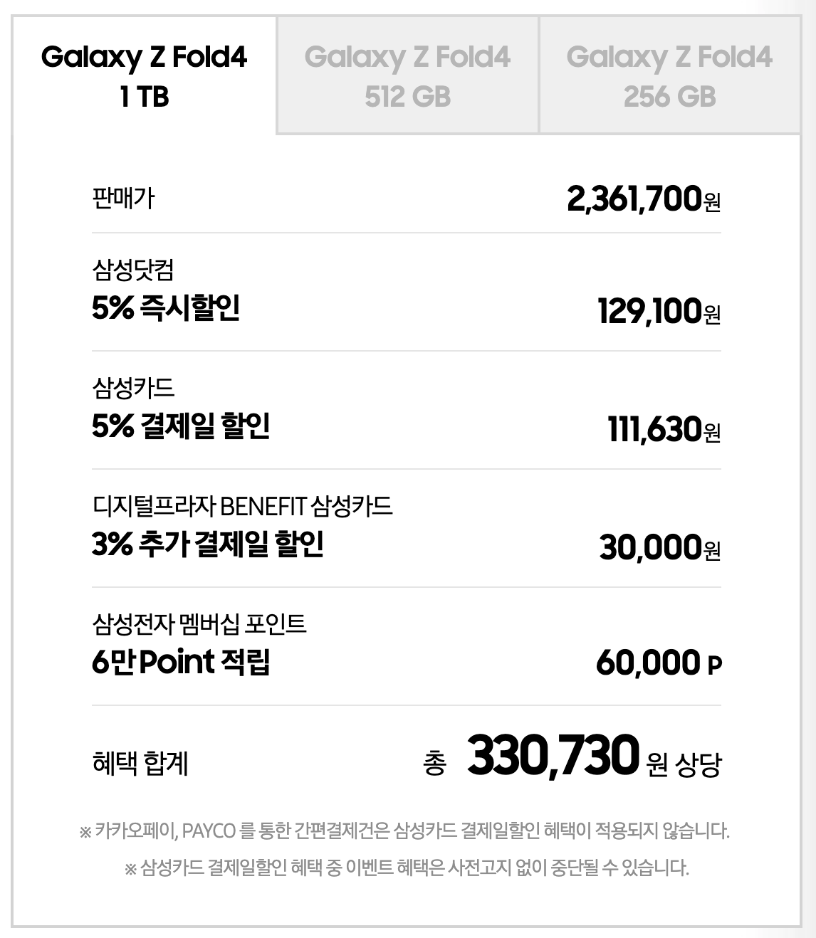 1TB 모델의 경우 여러가지 혜택을 더 하면 총 330,730원의 할인을 받을 수 있습니다.