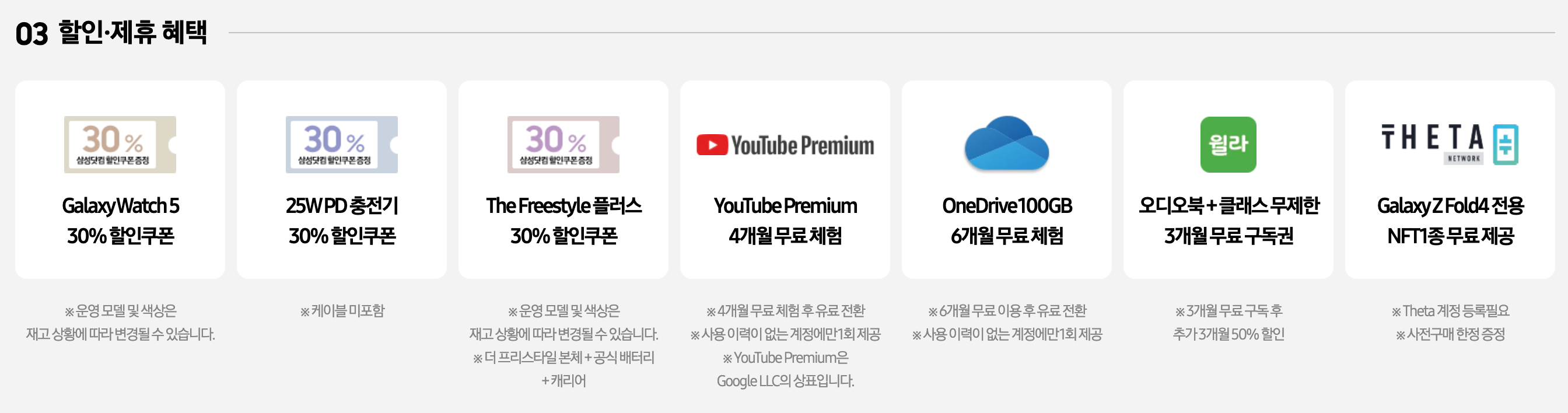 그밖에 갤럭시워치5 30% 할인권, 25W PD 충전기 30% 할인권, 유튜브 프리미엄 4개월 무료체험, 원드라이브 100GB 6개월 무료체험 등 다양한 할인 혜택 제휴가 있습니다.