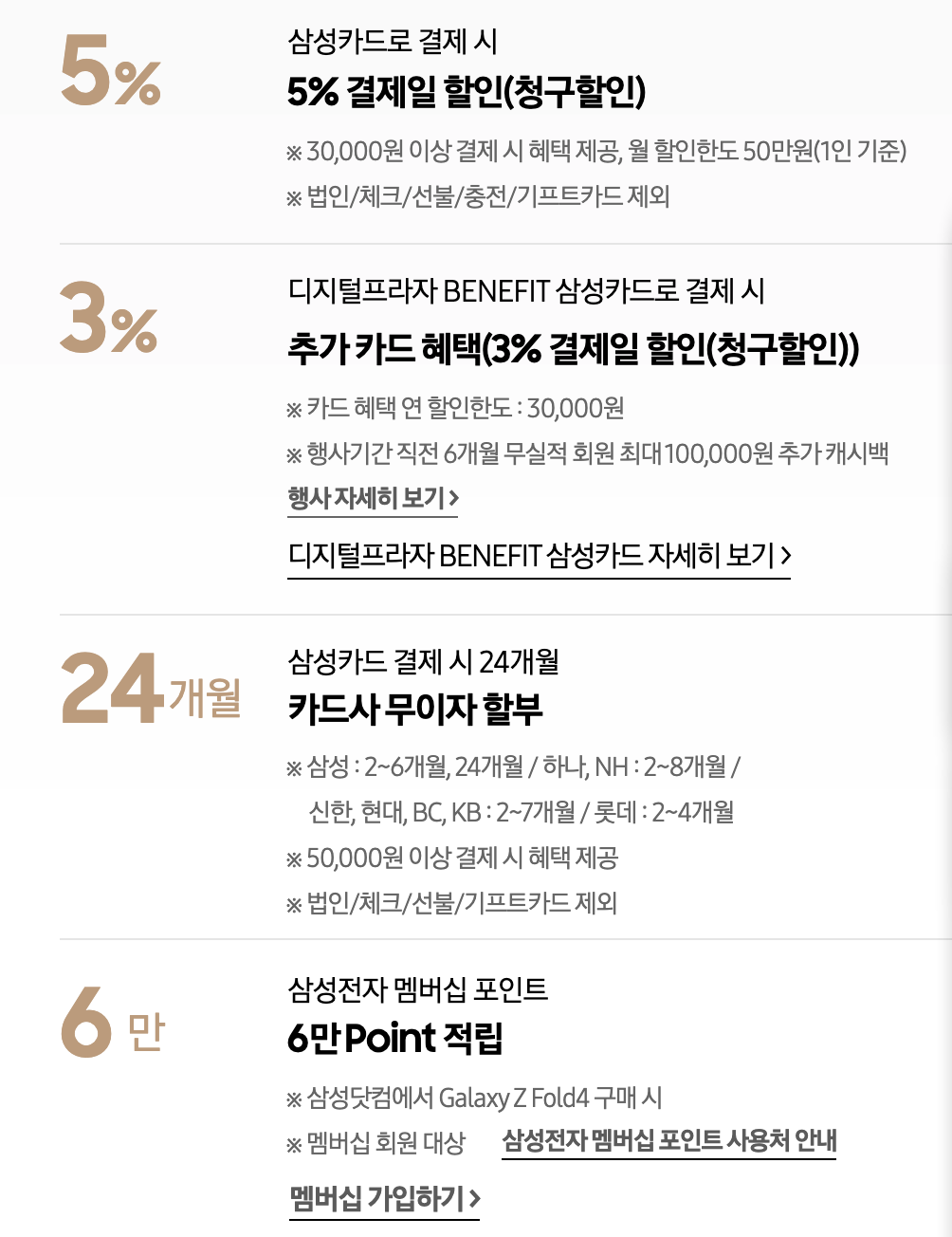 그리고 여기에 삼성전자 멤버십 포인트 6만점을 받고, 만약 삼성디지털 프라자 베네핏(benefit) 삼성카드로 구매하면 3만원 결제일 할인을 받을 수 있습니다. 만약 삼성카드가 없다면 이번 기회에 하나 만들어서 혜택을 보는 방법도 괜찮을 것 같습니다.