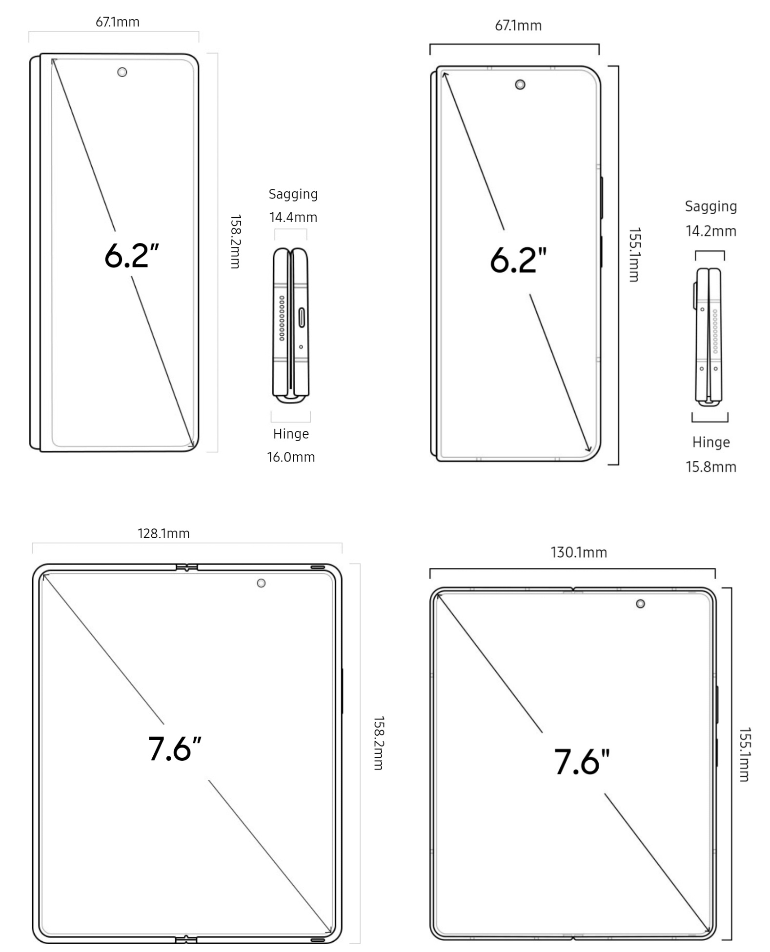 메인과 커버 화면 크기는 이전과 동일한 7.6인치, 6.2인치로 동일 하지만 화면 비율이 변화면서 해상도와 크기 역시 달라 졌습니다. 가로 길이가 2.7mm 늘고 세로는 3.1mm 줄었습니다.