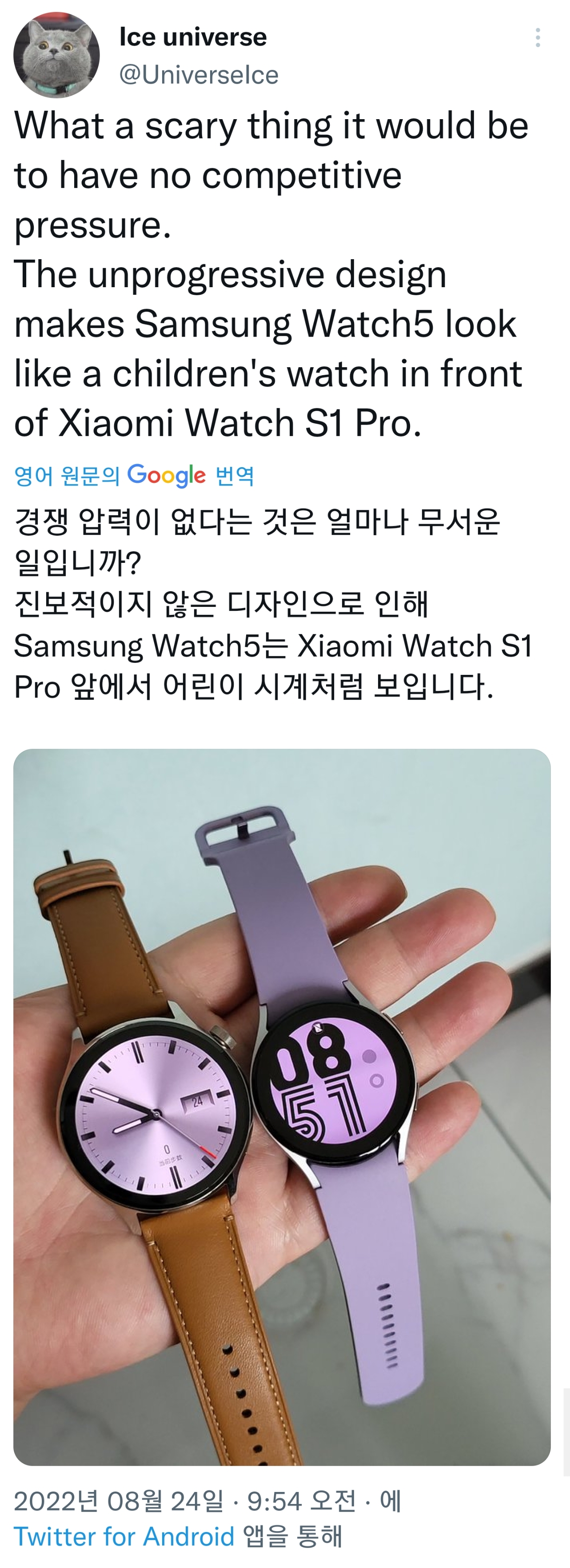 그리고 그 후에 올린 트윗에서는 더 심한 말로 갤워치5를 비난하고 있는데, 중국 '샤오미 워치 S1 프로' 와 비교 하면서 심지어 어린이 장난감 시계 같다고 혹평을 하고 있습니다.