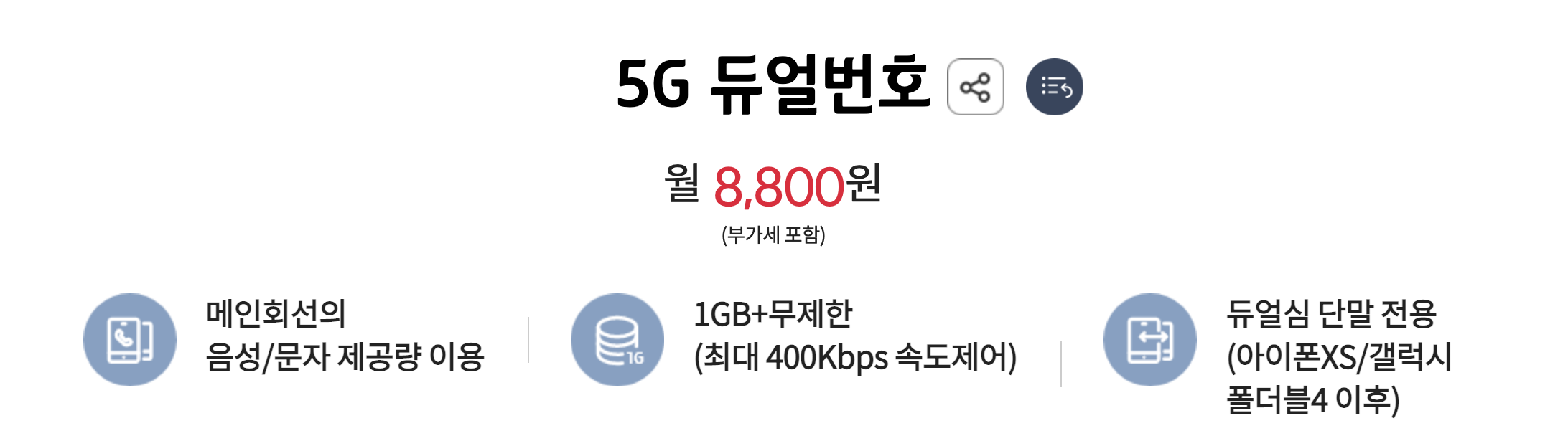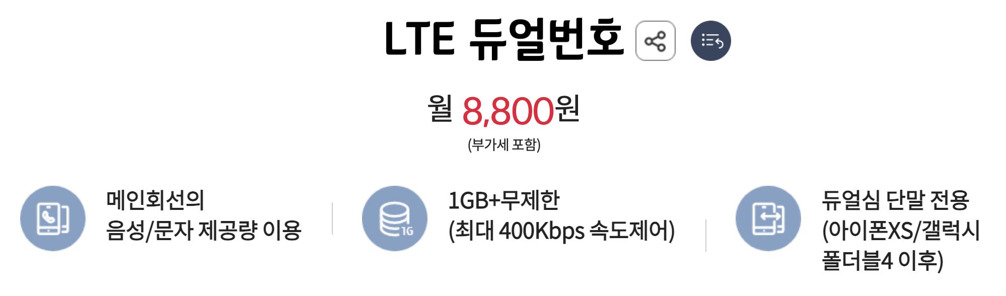 월 8800원에 두 번째 번호와 데이터 1GB를 제공하고, 데이터를 모두 소진하면 최대 400kbps 속도로 무제한 이용할 수 있습니다. 음성과 문자는 첫 번째 번호 제공량을 공유해서 사용하는 방식 입니다.