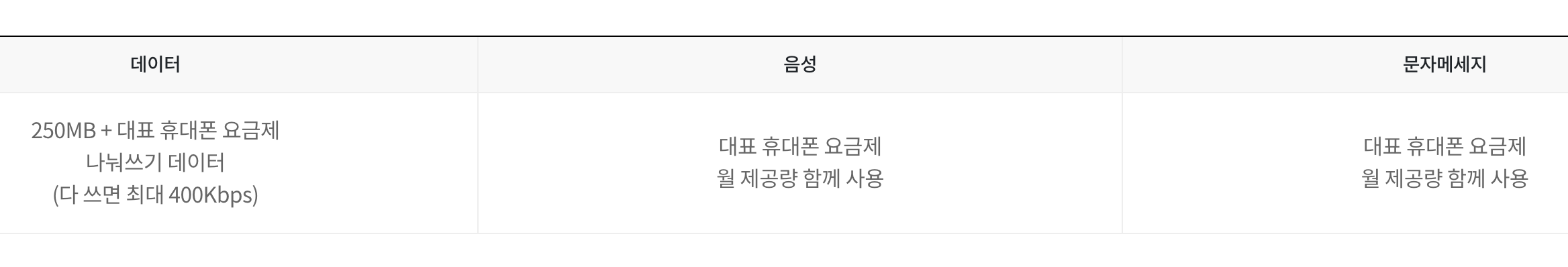 다 쓰면 최대 400Kbps 속도로 사용할 수 있습니다. 음성/문자는 메인회선 기본 제공량을 나눠 쓸 수 있습니다.