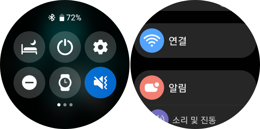 갤럭시워치 상단 설정창을 내려서 톱니바퀴 모양 아이콘을 클릭 합니다. 그리고 나서 와이파이 모양의 연결 메뉴를 클릭 합니다.
