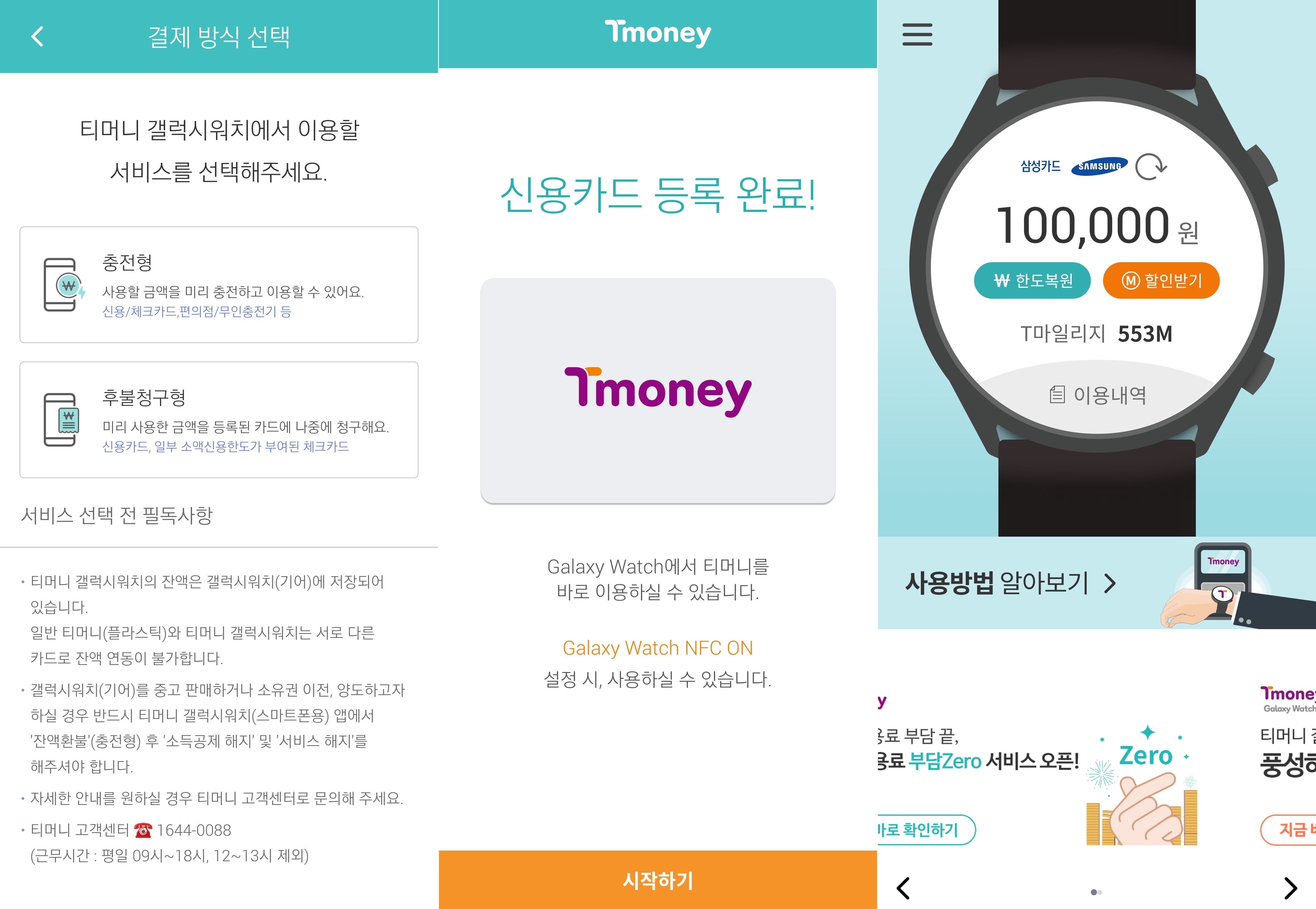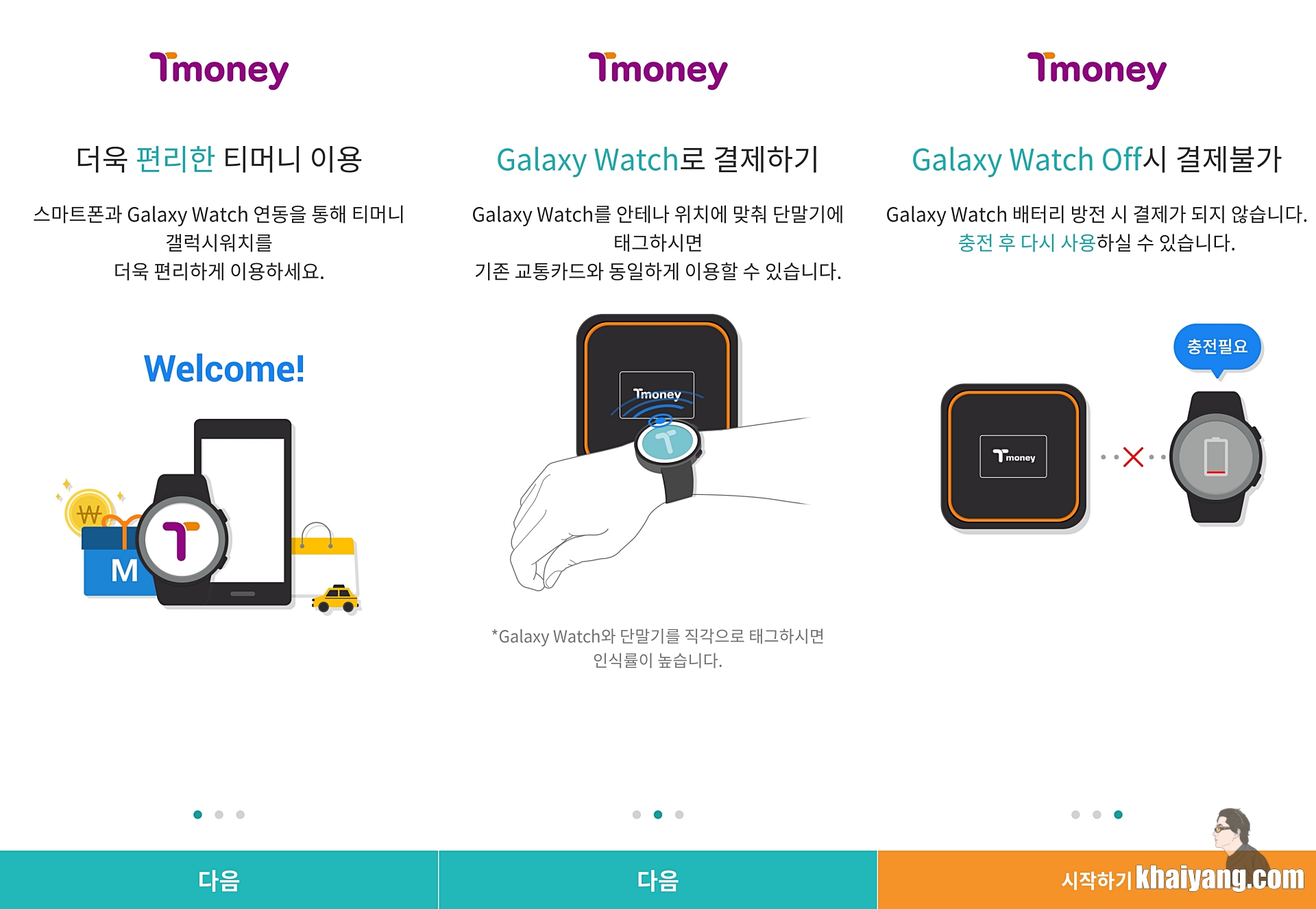 앱을 실행하면 첫 화면에 티머니 갤럭시워치 앱 사용 방법에 대해서 간단하게 나와 있습니다.