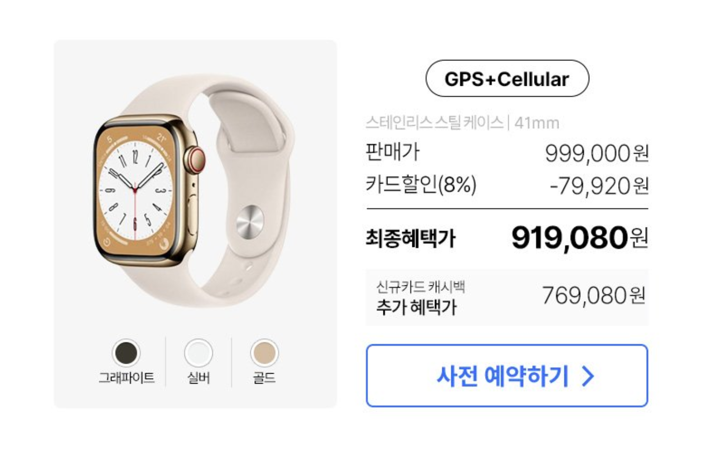 애플워치8 GPS 모델은 8% 할인을 받아서 551,080원에 구매할 수 있습니다. 가장 비싼 스테인레스 스틸케이스 같은 경우 캐쉬백 15만원까지 받으면 769,080원에 구매할 수 있습니다.