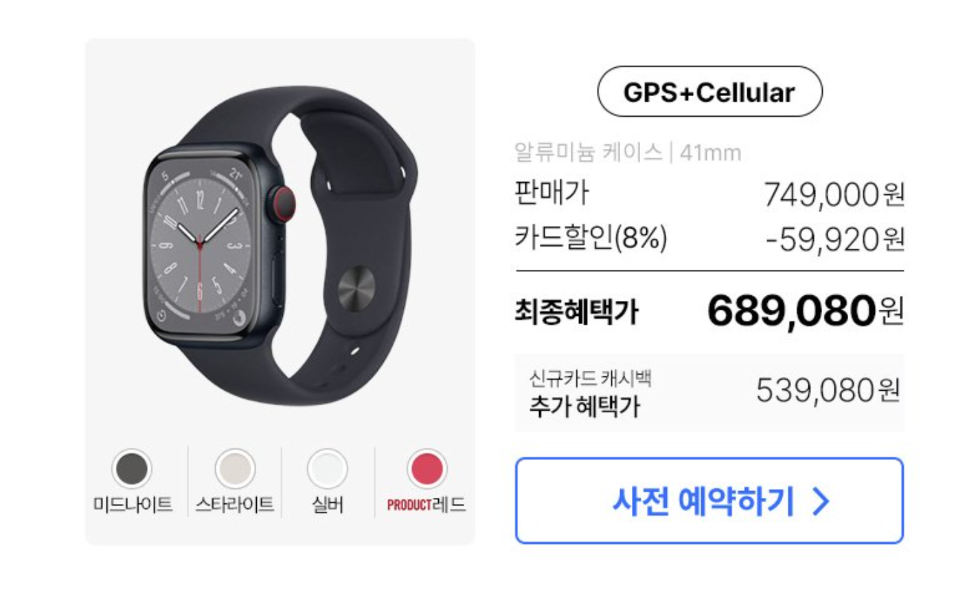 애플워치8 시리즈 같은 경우 애플 공식스토어, 통신3사, 그리고 11번가 쿠팡 같은 오픈마켓에서 현재 사전예약 진행중 입니다. 애플워치8 시리즈 한국 공식출시일은 10월7일 입니다.