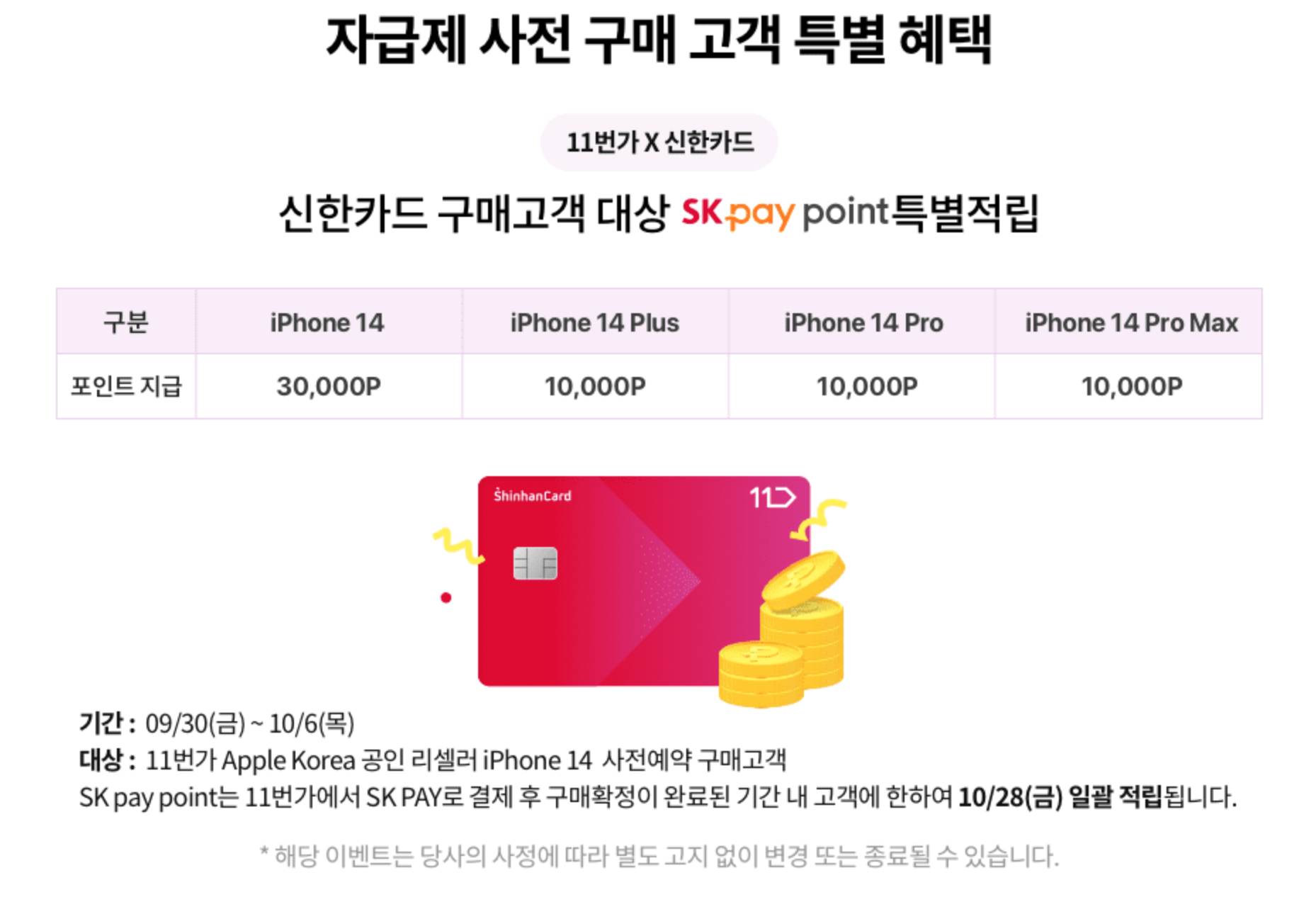 참고로 11번가 사전예약 혜택을 보니 아이폰14 일반/플러스는 10% 카드할인, 프로/프로맥스는 8% 할인을 받을 수 있습니다. 거기에 최대 22개월 카드 무이자에 ID당 3천원 할인을 받을 수 있습니다.