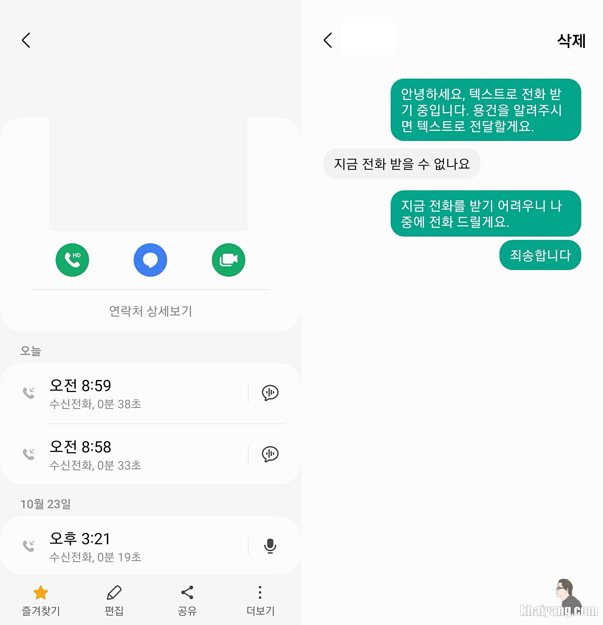 그러면 문자로 전화를 받은 항목이 보이고 어떤 내용의 대화가 오고 갔는지 텍스트로 확인할 수 있습니다.