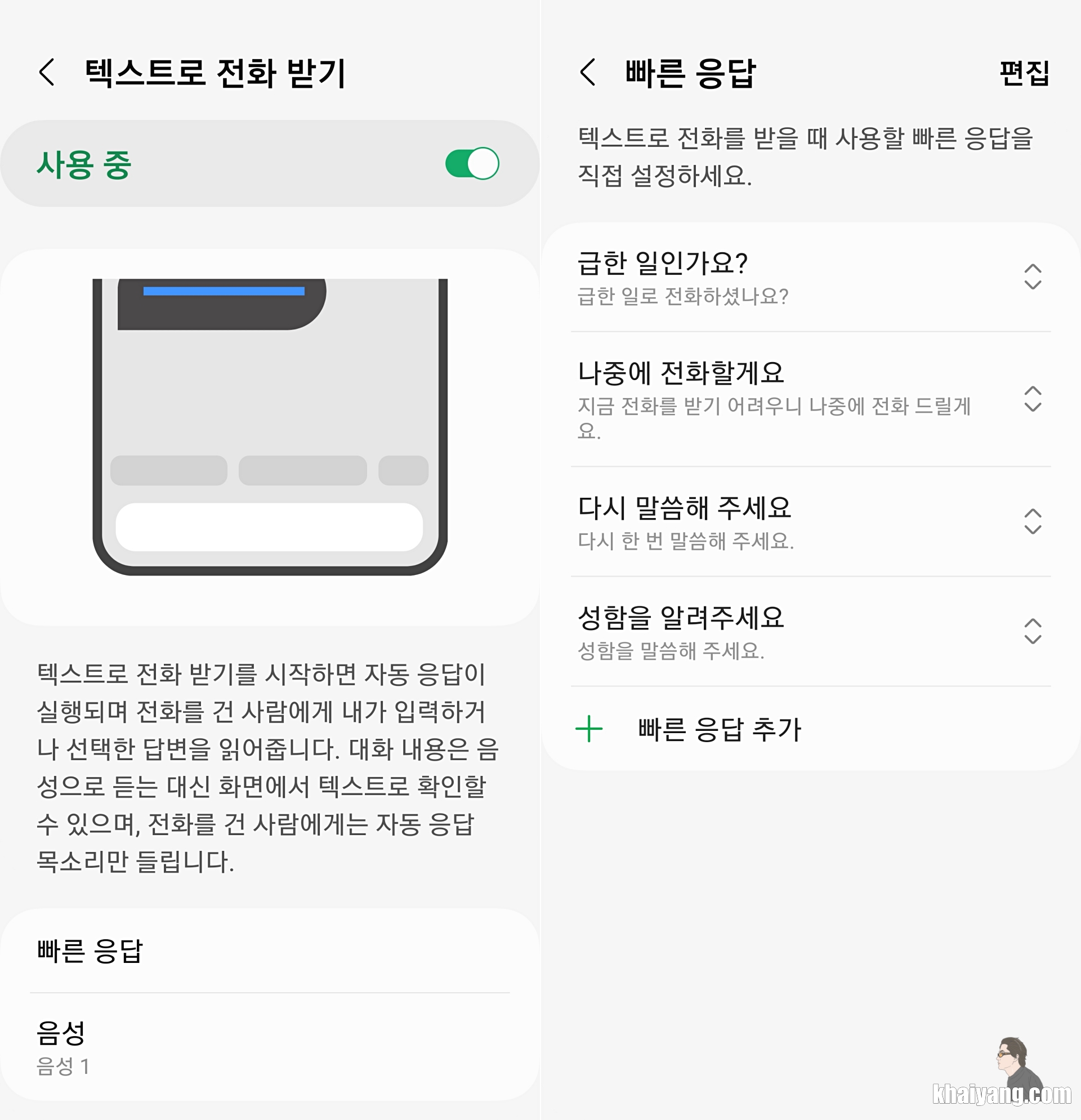 텍스트로 전화받기 기능은 예전에 유선전화기 시절 사용하던 자동응답기와 비슷한 점이 있습니다. 상대방이 전화를 할때 받지 못하면 미리 설정한 문구대로 인공지능 보이스가 답변을 읽어 줍니다.