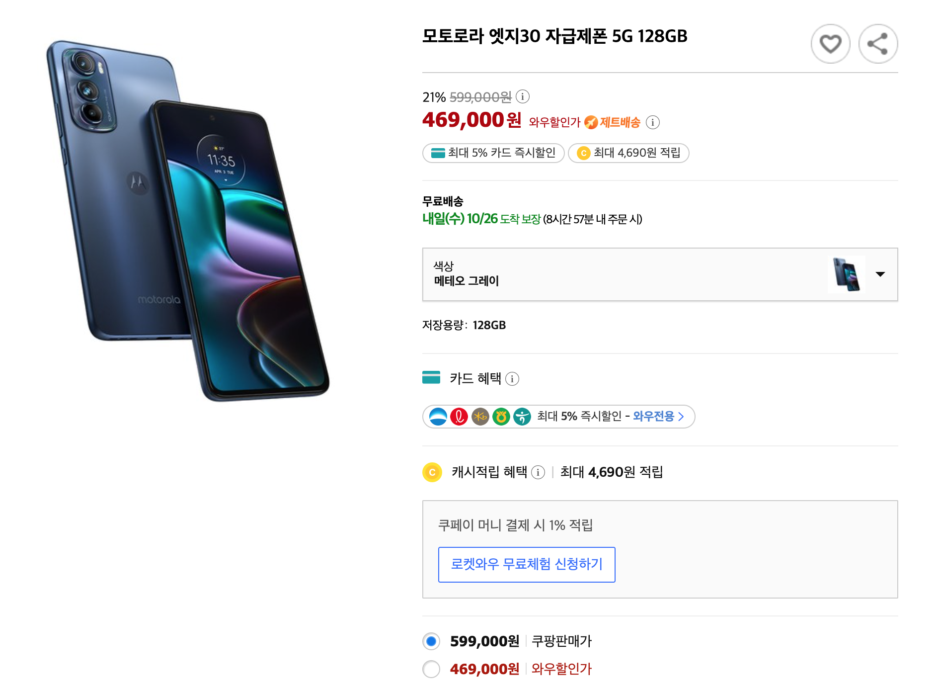 쿠팡에서 판매 개시일인 25일 단 하루 출고가 59만9000원의 모토로라 엣지30을 21% 할인된 46만9000원에 선보이는 한정 프로모션을 진행하고 있습니다.