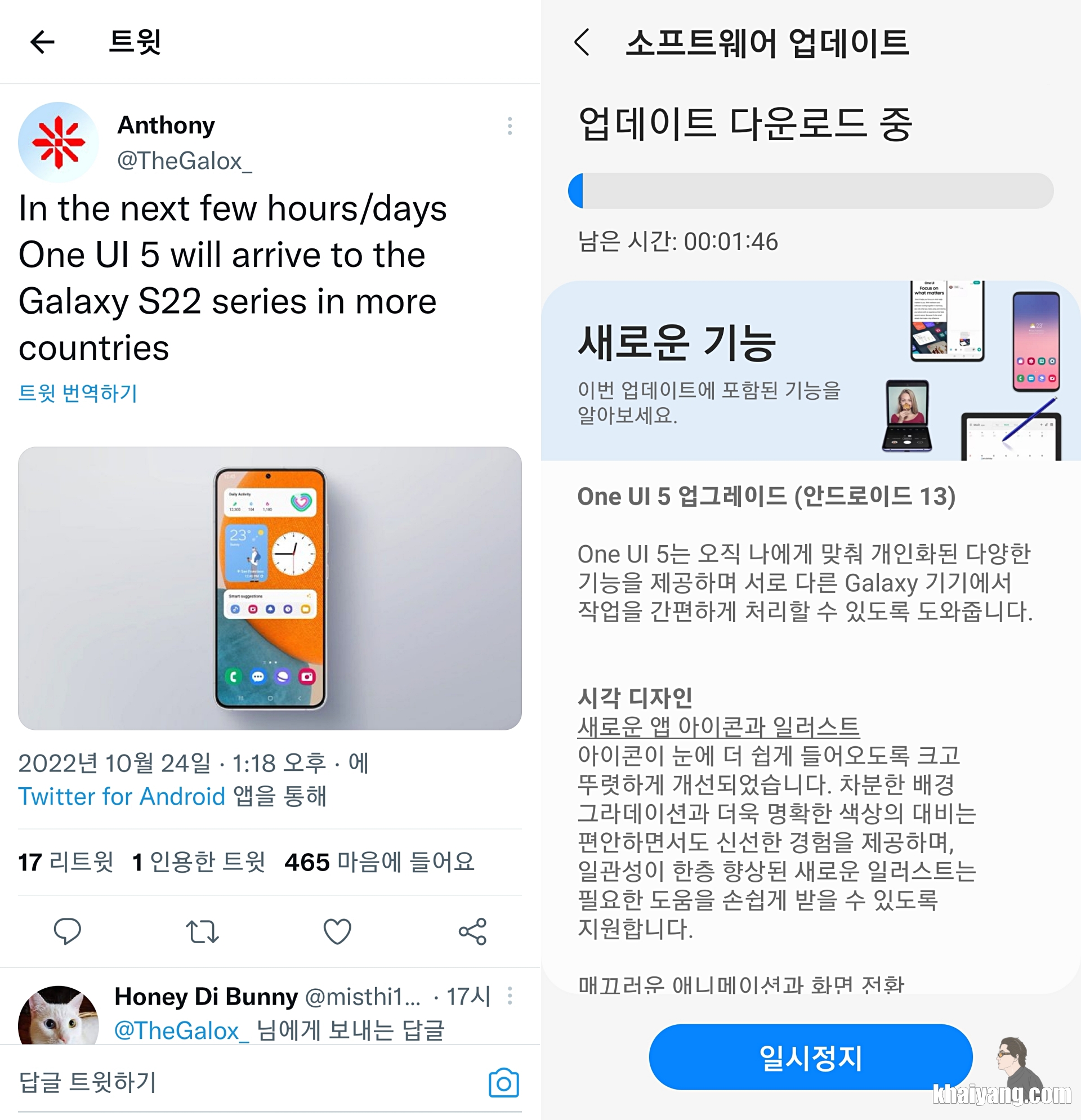 오늘 아침에 일어나서 트위터를 보고 있는데 해외 유명 팁스터들이 갤럭시S22 울트라 모델에 최신 원유아이(UI) 5.0 그리고 안드로이드 13으로 업그레이드 되었다는 트윗을 올린 것을 보았습니다.