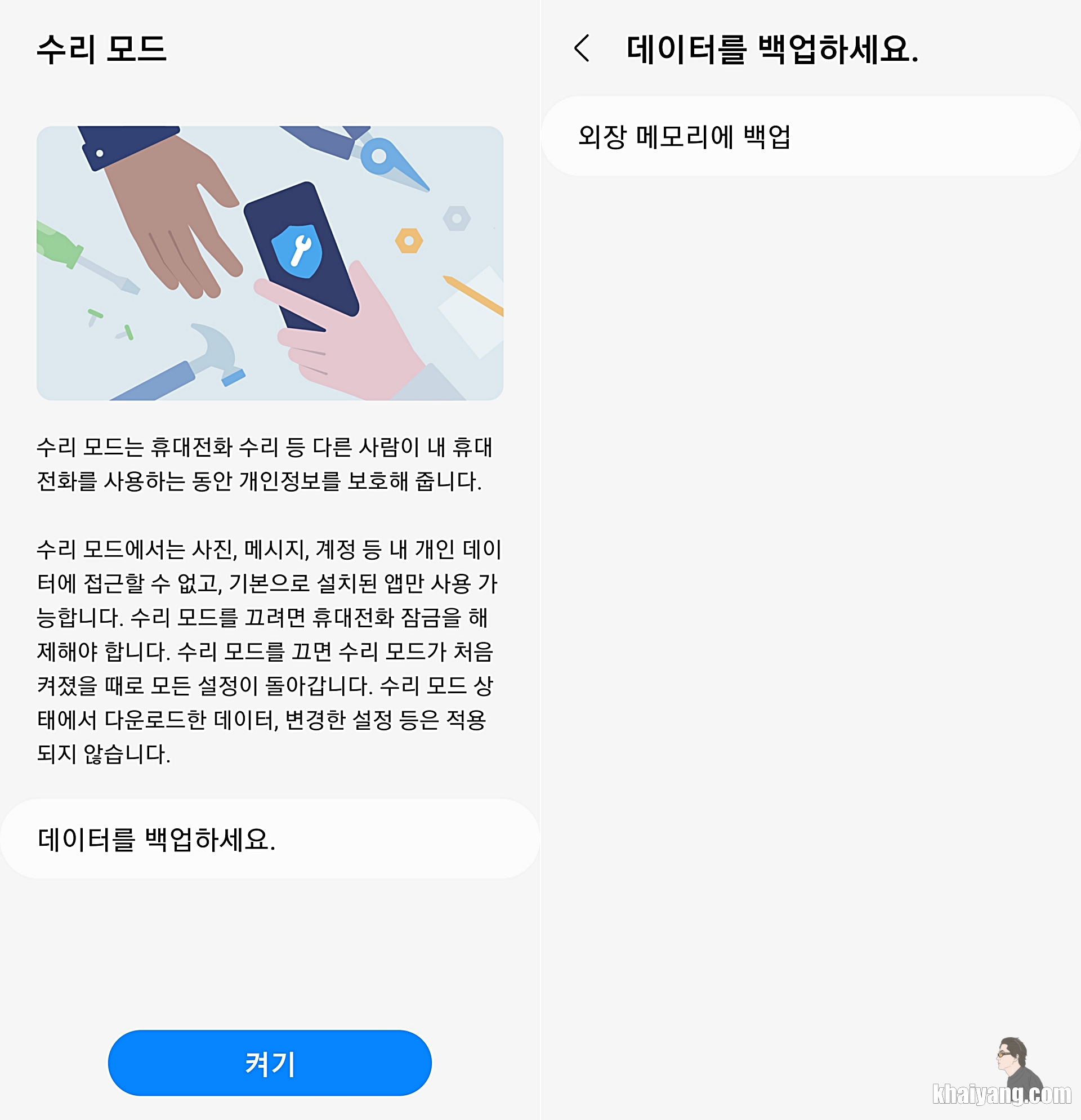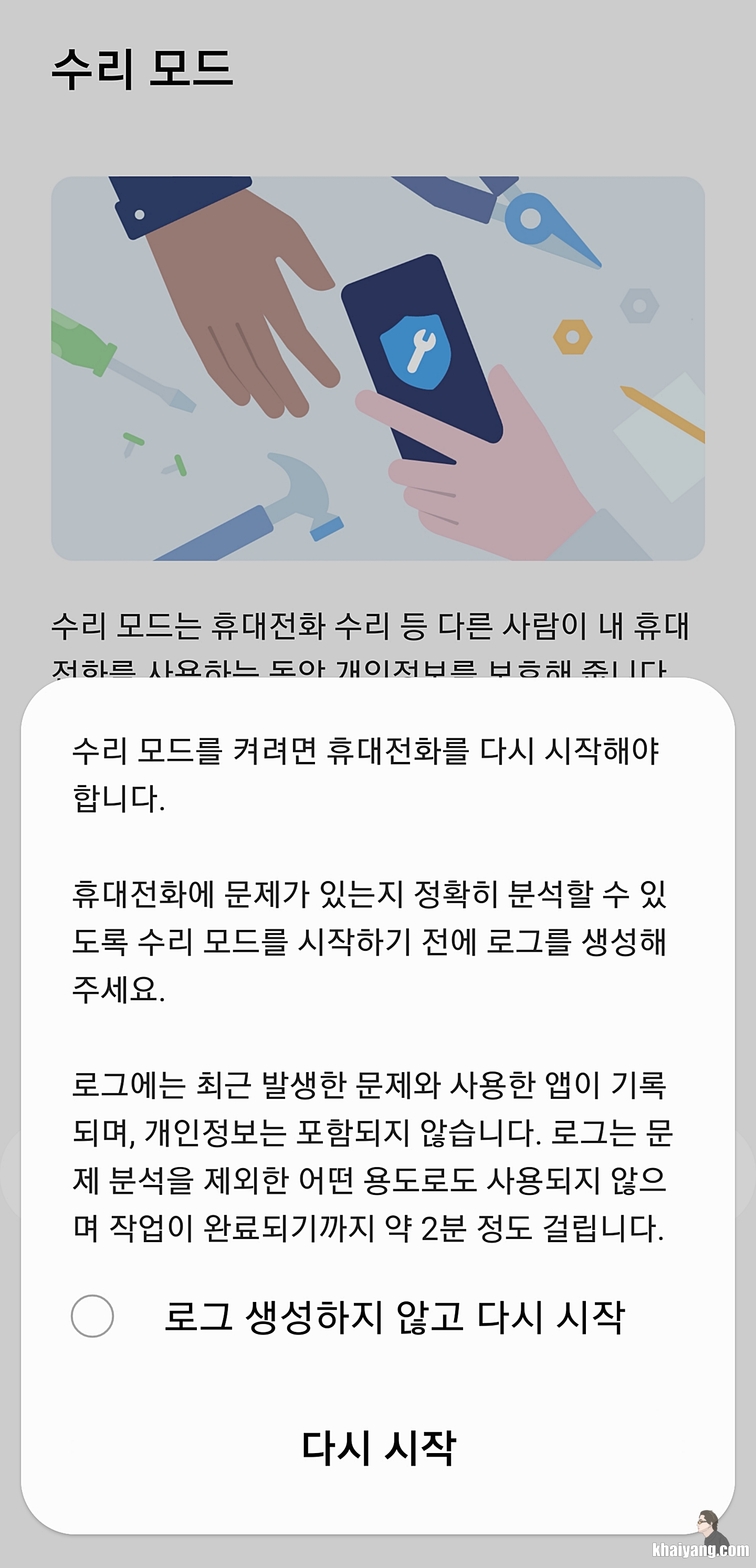 '수리모드는 휴대전화 수리 등 다른 사람이 내 휴대전화를 사용하는 동안 개인정보를 보호해 줍니다. 수리 모드에서는 사진, 메시지, 계정 등 내 개인 데이터에 접근할 수 없고, 기본으로 설치된 앱만 사용 가능 합니다.