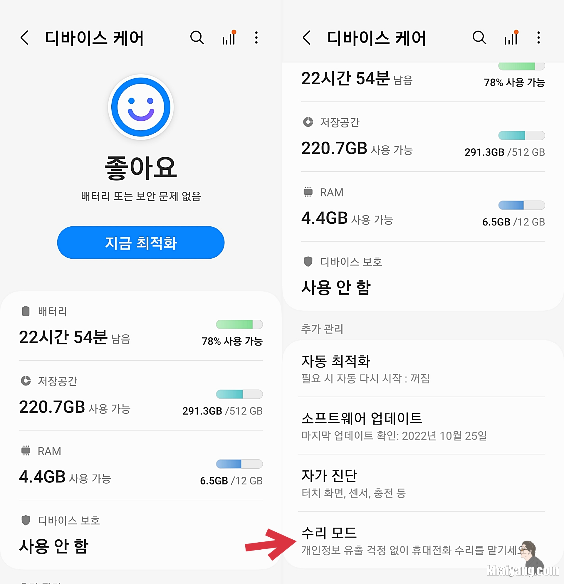 디바이스 케어 화면이 나오면서 배터리 시간, 저장 공간 등 여러가지 스마트폰 상태를 알려주는 창이 나옵니다. 거기서 쭉 내리면 가장 끝에 '수리모드' 메뉴가 새롭게 추가된 것을 확인할 수 있습니다.