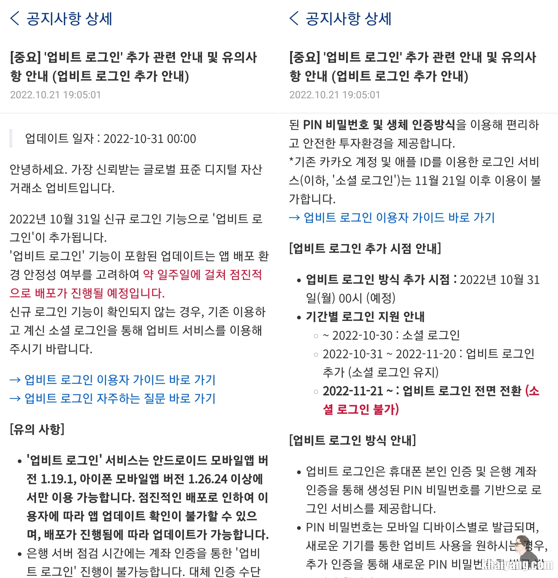 11월 21일 부터는 새롭게 바뀐 업비트 로그인 방식으로만 로그인을 할 수 있다고 하니 이글을 보신 업비트 이용자들은 빠르게 전환하시기 바랍니다.