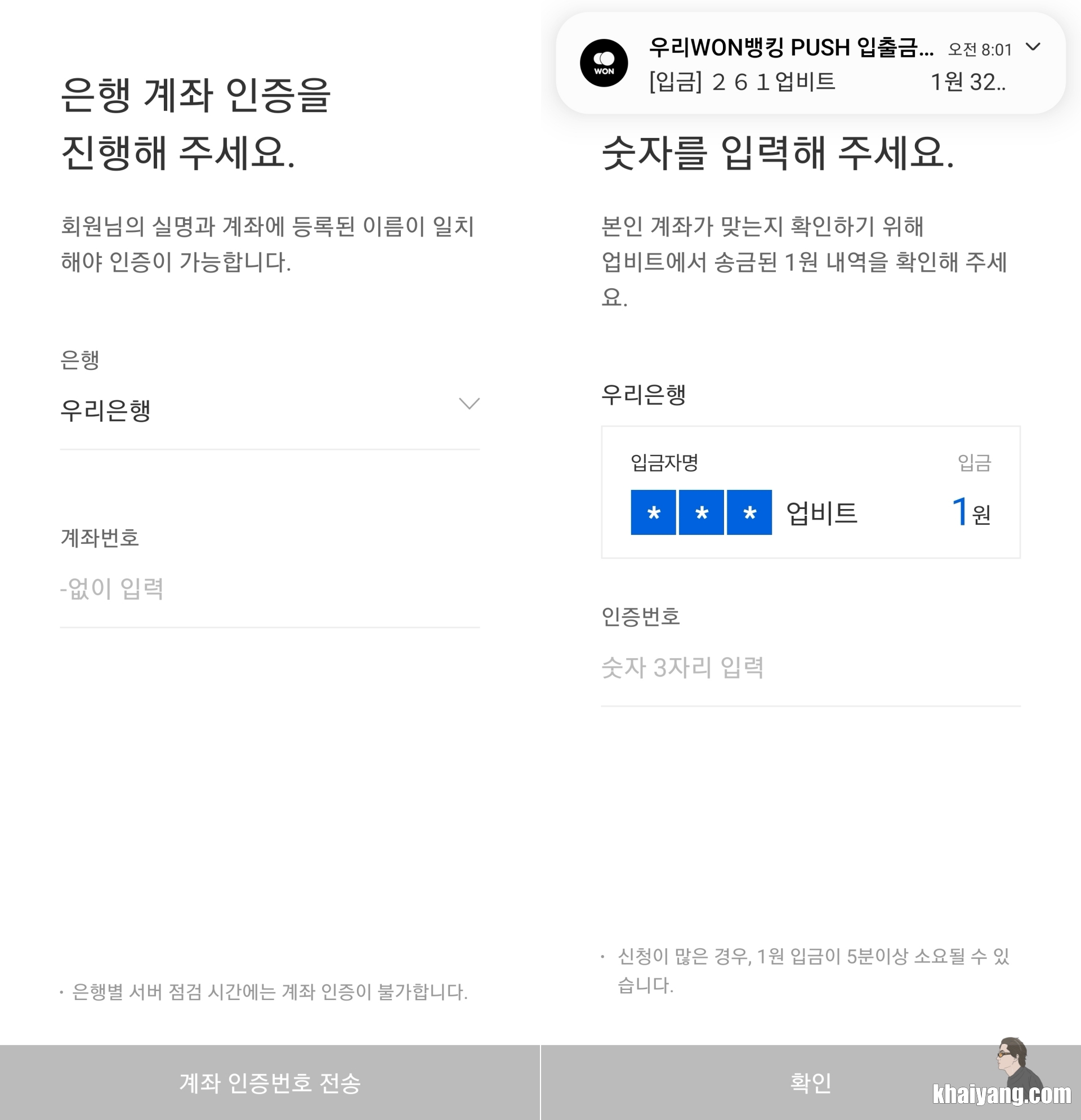 계좌 번호 입력하고 나면 업비트에서 1원 입금되었다는 푸시 알람이 뜹니다.