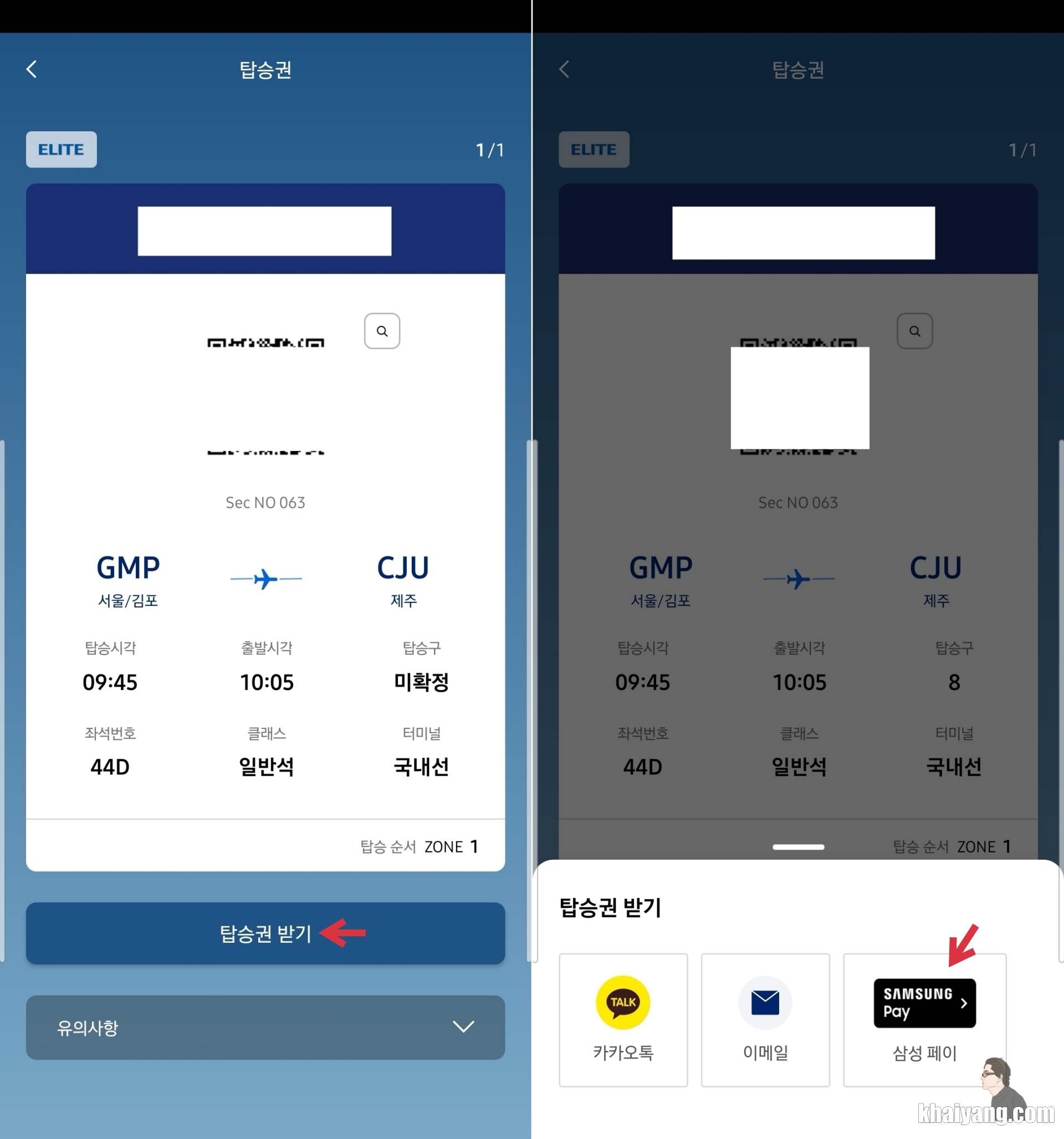 화면을 보면 '탑승권 받기' 메뉴를 클릭 하면 카카오톡, 이메일, 삼성페이 3가지 중에 하나를 선택할 수 있습니다. 편한 것을 선택하면 되는데 평소 삼성페이를 잘 이용하고 계시다면 삼성페이로 탑승권 받는 것을 추천 드립니다.